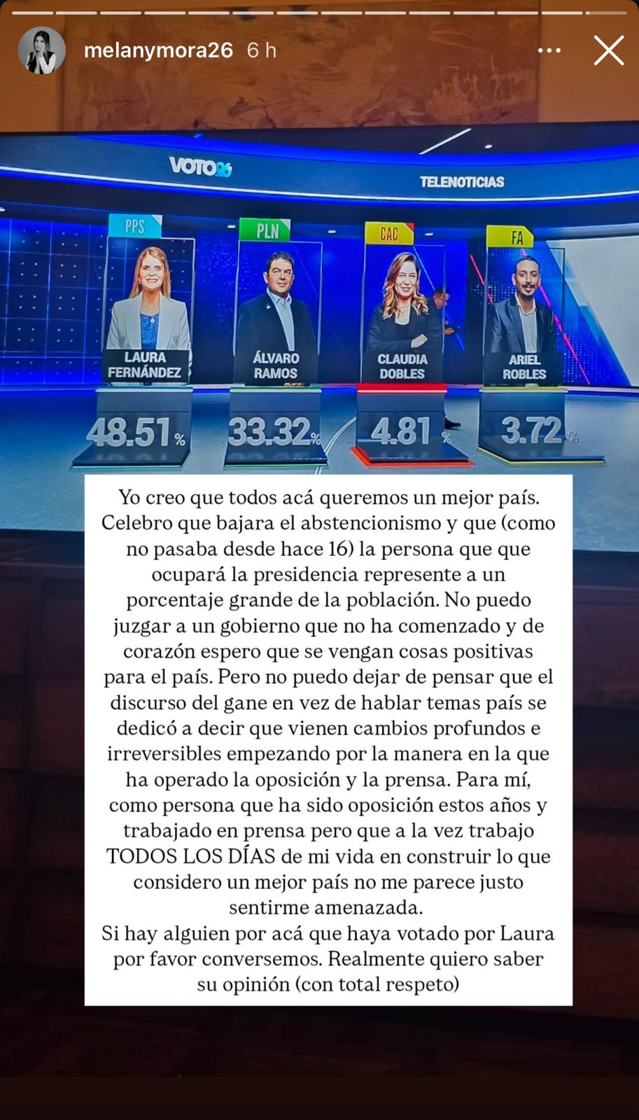 La reconocida productora de Los Chinaokes, Melany Mora, brindó un mensaje contundente tras darse a conocer los resultados de las elecciones presidenciales, reconociendo a Laura Fernández como presidenta electa.