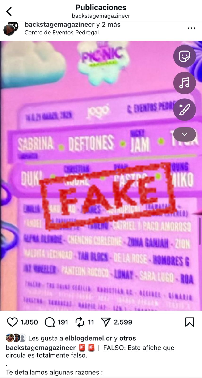 La imagen que circula es casi en su totalidad borrosa, por lo que resulta difícil distinguir con claridad al resto de artistas mencionados. Sin embargo, la página de conciertos Backstage Magazine confirmó que el flyer no es oficial, ya que se trata de un contenido falso, y explicó varias razones por las cuales no podría ser auténtico: