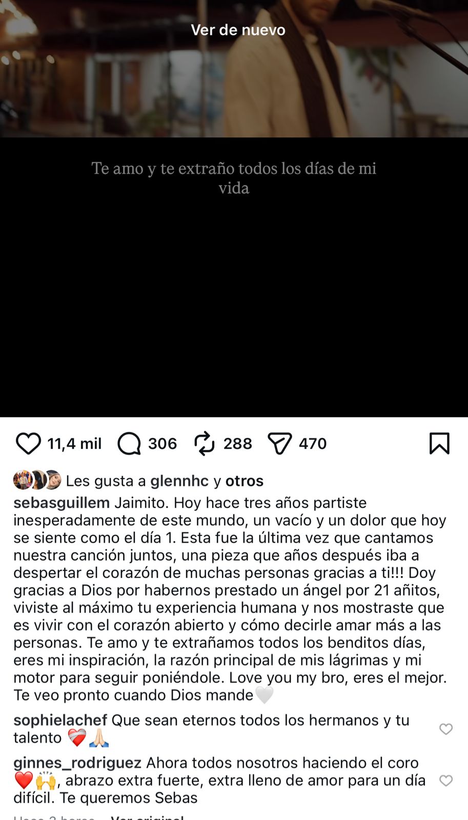 Jaimito. Hoy hace tres años partiste inesperadamente de este mundo, un vacío y un dolor que hoy se sienten como el día uno. Esta fue la última vez que cantamos nuestra canción juntos, una pieza que años después despertaría el corazón de muchas personas gracias a ti, mencionó Guillem.