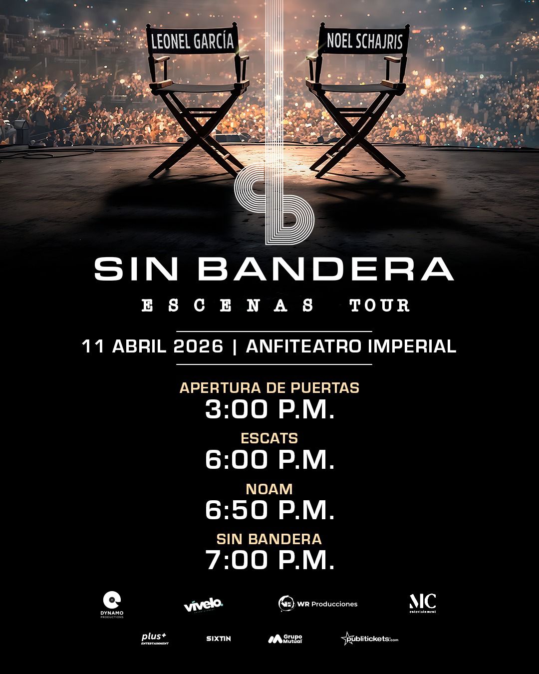 A esa misma hora, también subirá al escenario Noam, quien se encargará de calentar aún más el ambiente para los fanáticos que esperan ver a la agrupación Sin Bandera. Finalmente, a las 7:00 p. m., el dúo principal ofrecerá su esperado concierto.