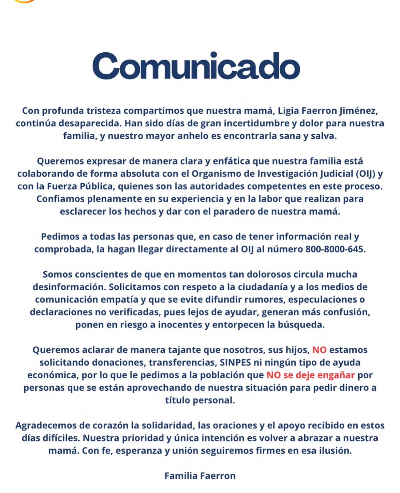 Con profunda tristeza compartimos que nuestra mamá, Ligia Faerron Jiménez, continúa desaparecida. Han sido días de gran incertidumbre y dolor para nuestra familia, y nuestro mayor anhelo es encontrarla sana y salva. Queremos expresar de manera clara y enfática que nuestra familia está colaborando de forma absoluta con el Organismo de Investigación Judicial (OIJ) y con la Fuerza Pública, quienes son las autoridades competentes en este proceso. Confiamos plenamente en su experiencia y en la labor que realizan para esclarecer los hechos y dar con el paradero de nuestra mamá, se lee en el comunicado.