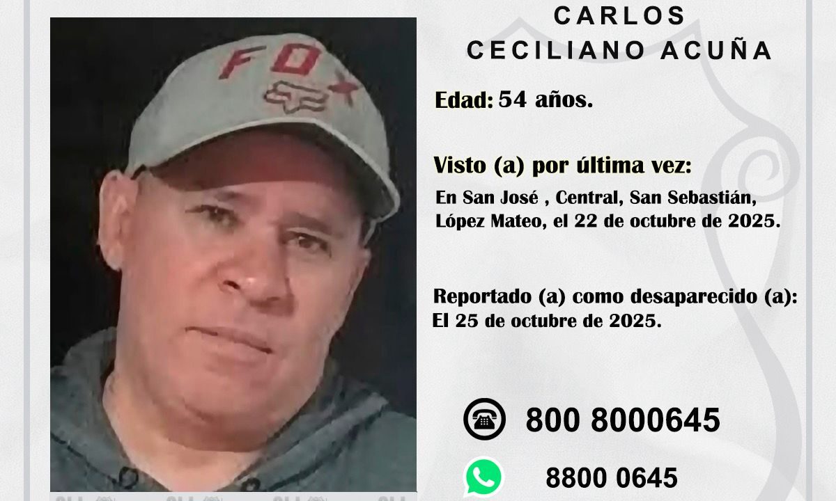 Se trata de Carlos Ceciliano Acuña, de 54 años, quien fue reportado como desaparecido el 25 de octubre de 2025.