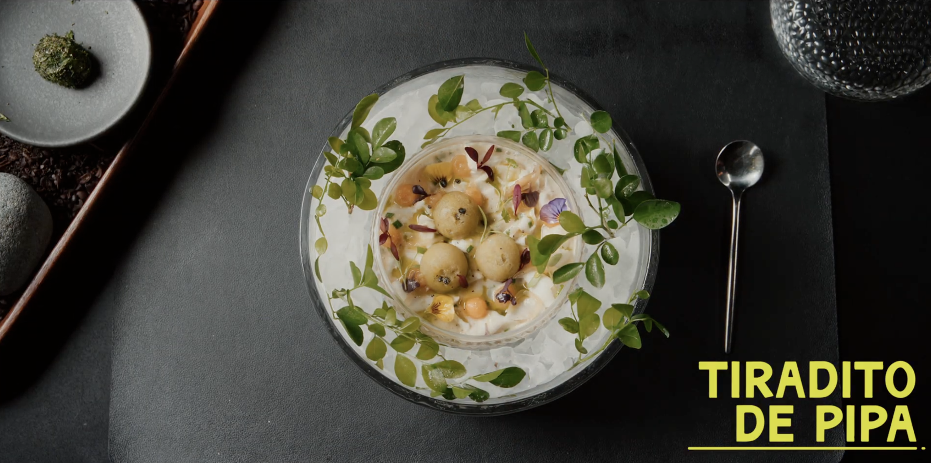 Este plato funciona como una declaración de principios. La pipa se trabaja desde el respeto absoluto al producto: la parte más tierna se presenta como tiradito y el resto se transforma, tras pasar por las brasas, en una leche de tigre vegana profunda y vegetal. Fermentos, dulzor contenido y acidez bien medida construyen un plato fresco pero complejo, que no busca imitar, sino reinterpretar, y que deja claro que en Conservatorium nada se descarta y nada se hace sin intención.