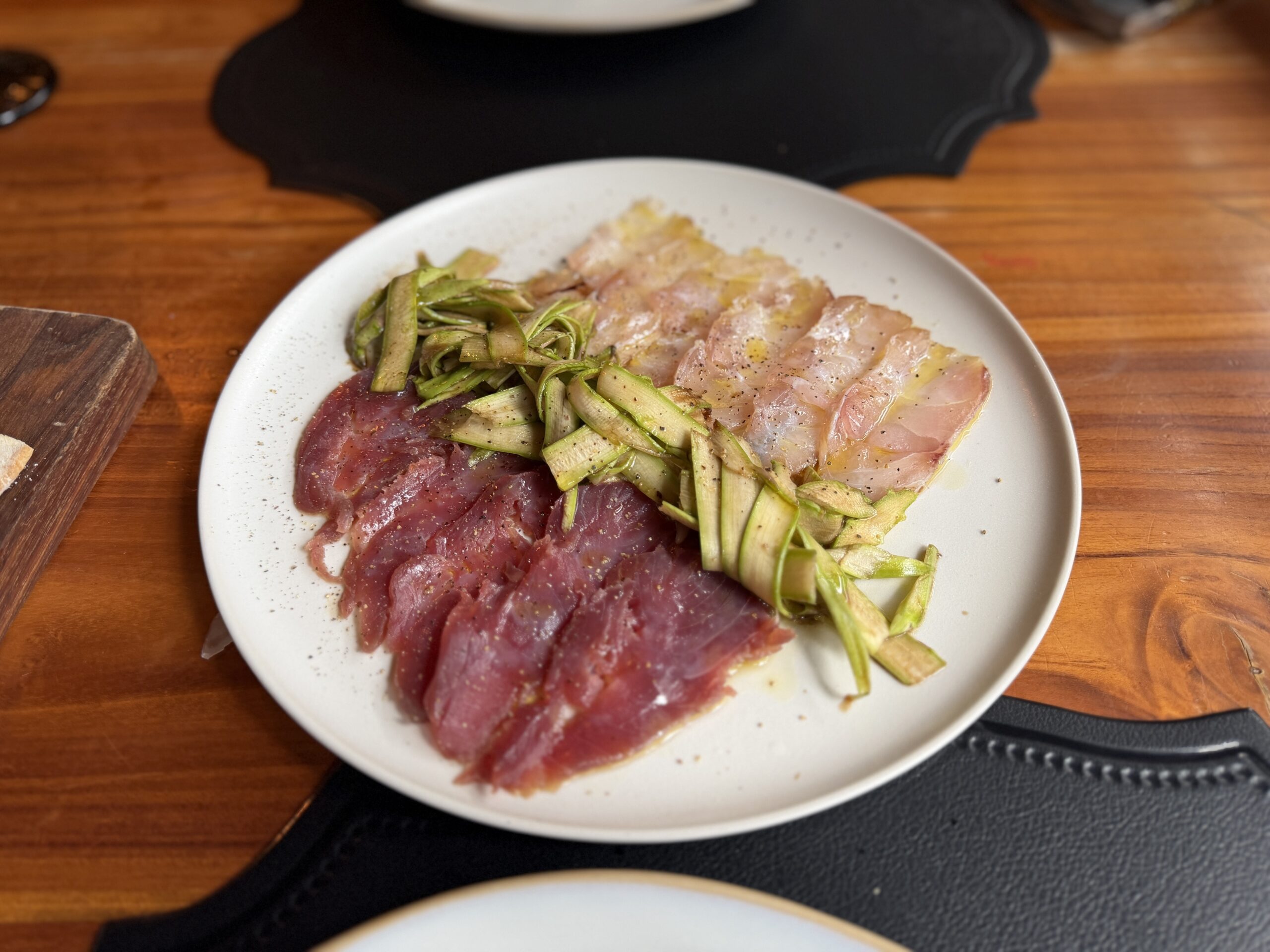 Bresaola mista di tonno i corvina: cortes finos de atún aleta amarilla y corvina curados entre 24 y 48 horas, acompañados de espárragos marinados con balsámico que le suman acidez y profundidad.