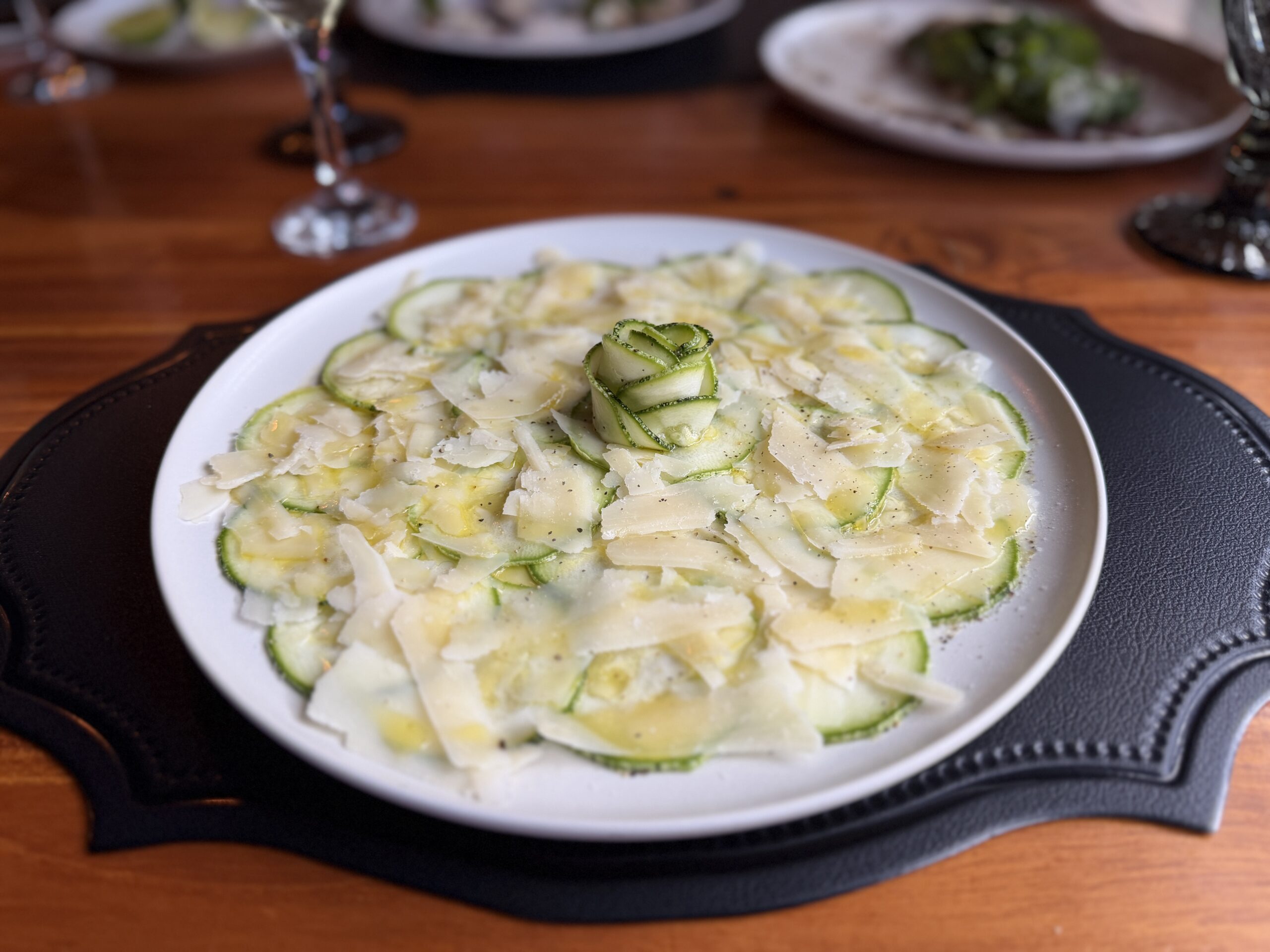 Carpaccio de zucchini y parmesano: láminas finas de zucchini con queso parmesano, donde la simplicidad del plato resalta la calidad del producto y el balance natural de sabores.
