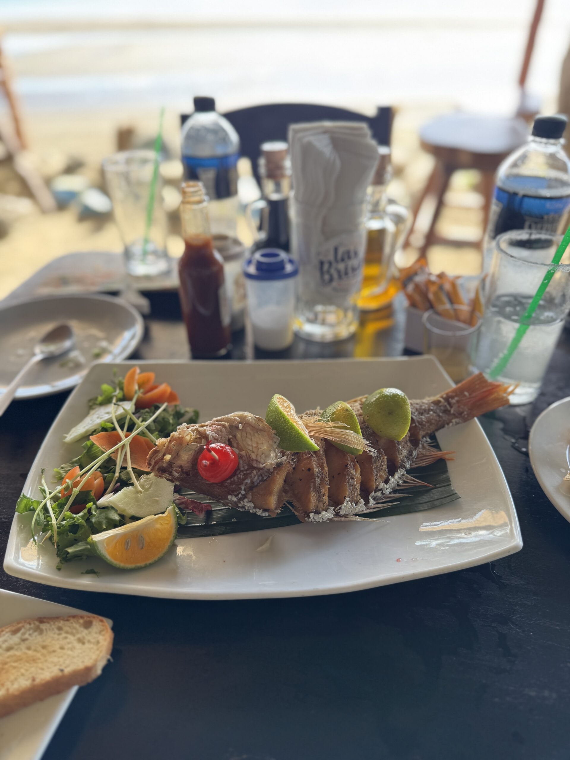 Pargo entero: El plato más representativo de la costa. Un pescado entero, frito a la perfección, con piel crujiente y carne suave, acompañado de arroz con frijoles, ensalada y plátano maduro. No hay mejor forma de probar el sabor auténtico del Pacífico.