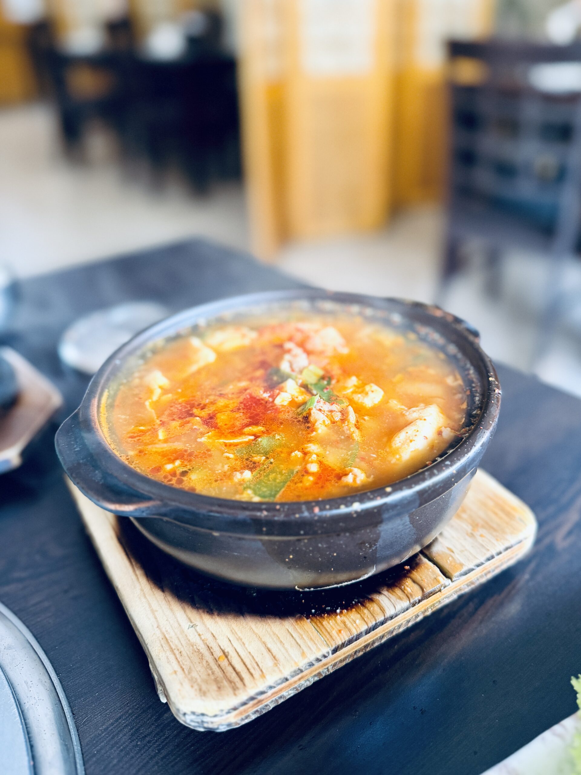 Sundubu jjigae: Sopa picante de tofu suave con una combinación de mariscos y carnes. Ideal para amantes del picante aunque también se puede pedir sin.