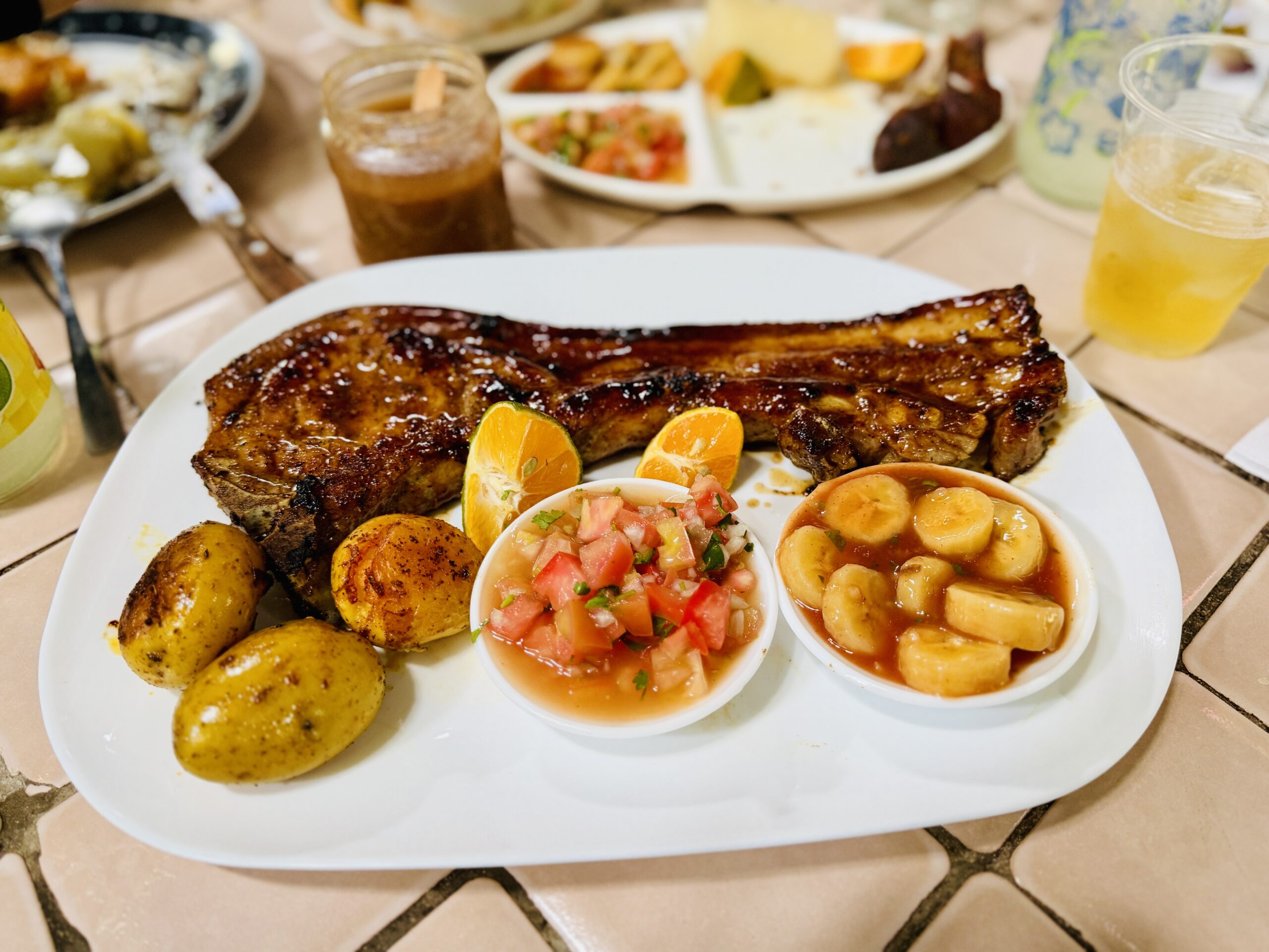 Costilla francesa: Un pedazo entero de costilla, con hueso, generoso y contundente. Es un plato para compartir fácilmente entre tres personas, pensado para comer sin prisa y con hambre real.