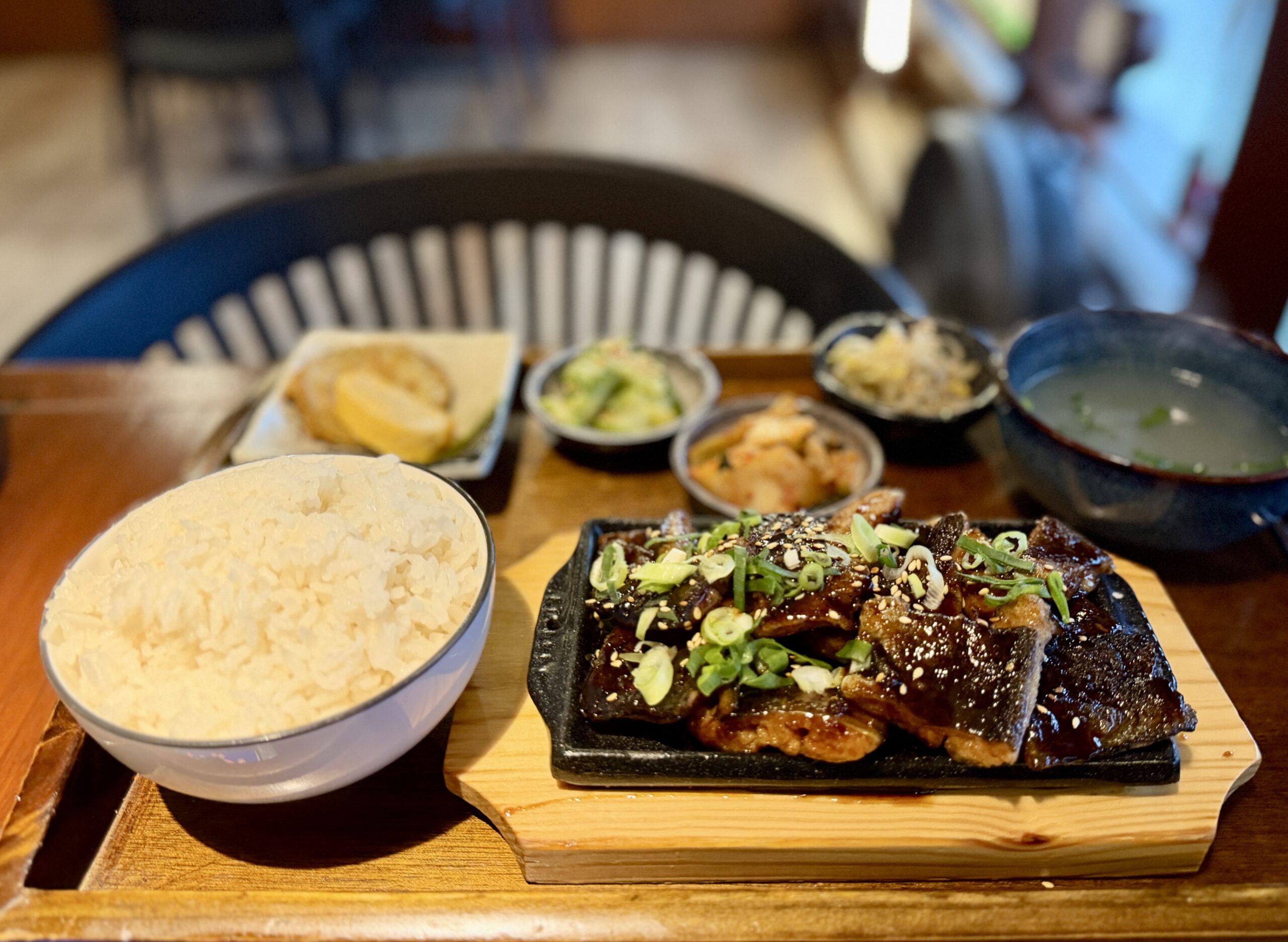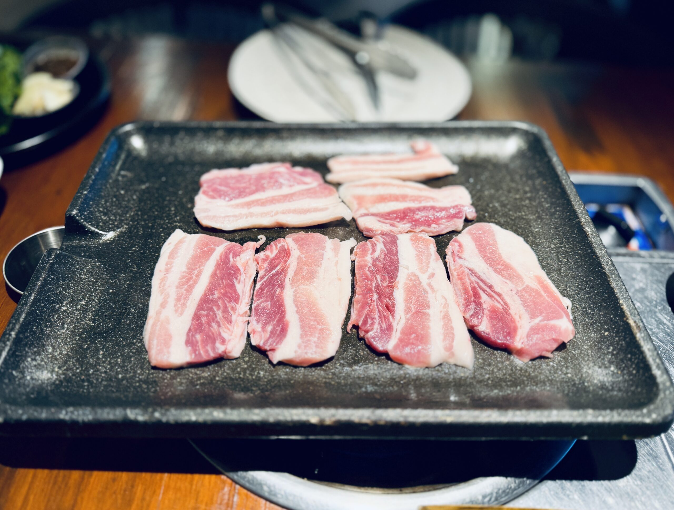 Es un formato clásico, humilde y profundamente cultural, tal como se consumía el barbecue en Corea antes del auge económico que hizo más accesible la carne de res. El menú funciona a través de menús combinados: elegís la proteína y te llega una mesa llena de acompañamientos, guarniciones y banchan, permitiendo una experiencia generosa y casera donde cada elemento tiene su propósito en el equilibrio del sabor.