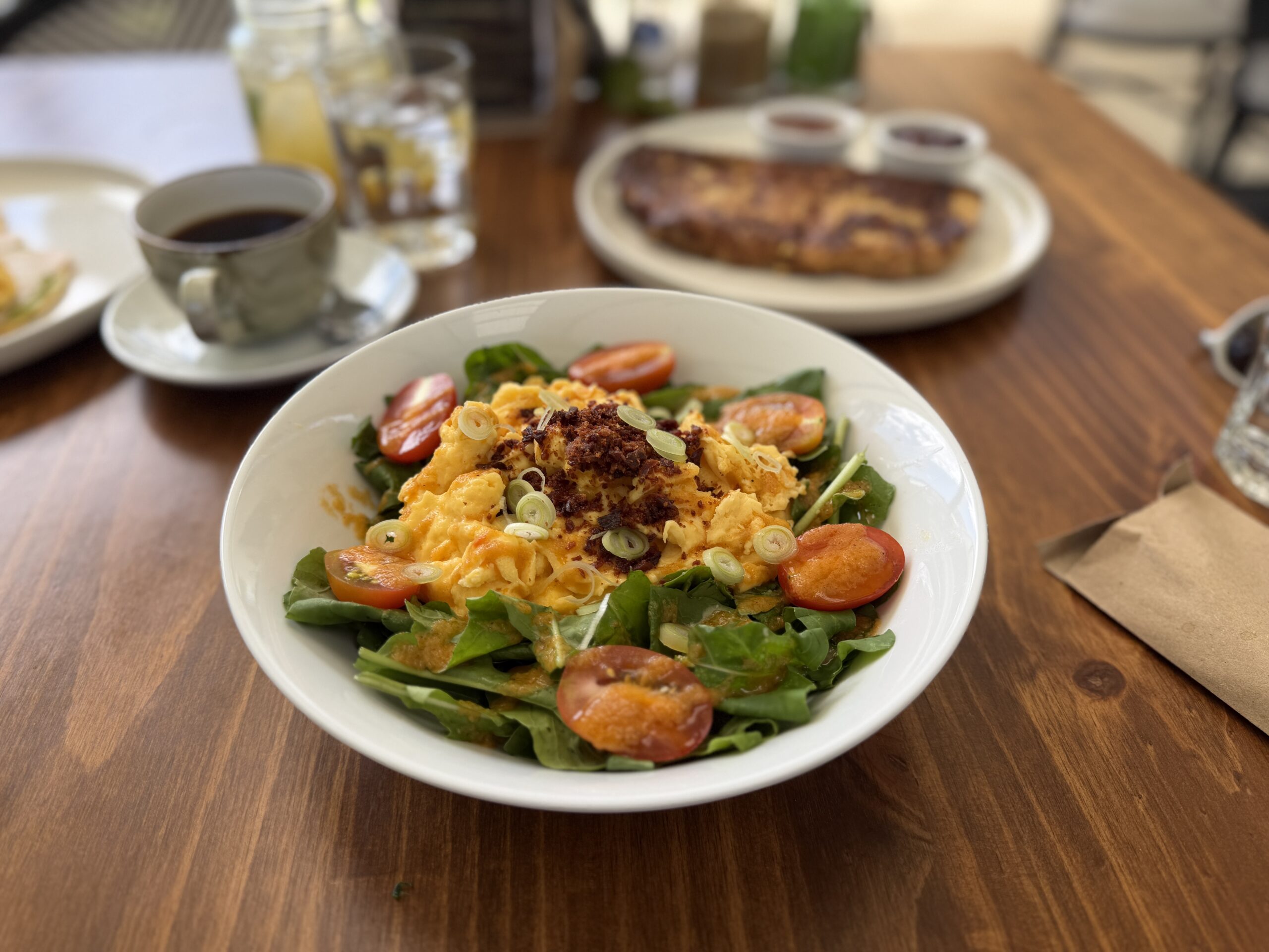 Desayuno inglés: Huevos revueltos encima de una cama de ensalada, trozos de tomate cherry, cebollino y tocineta picada.