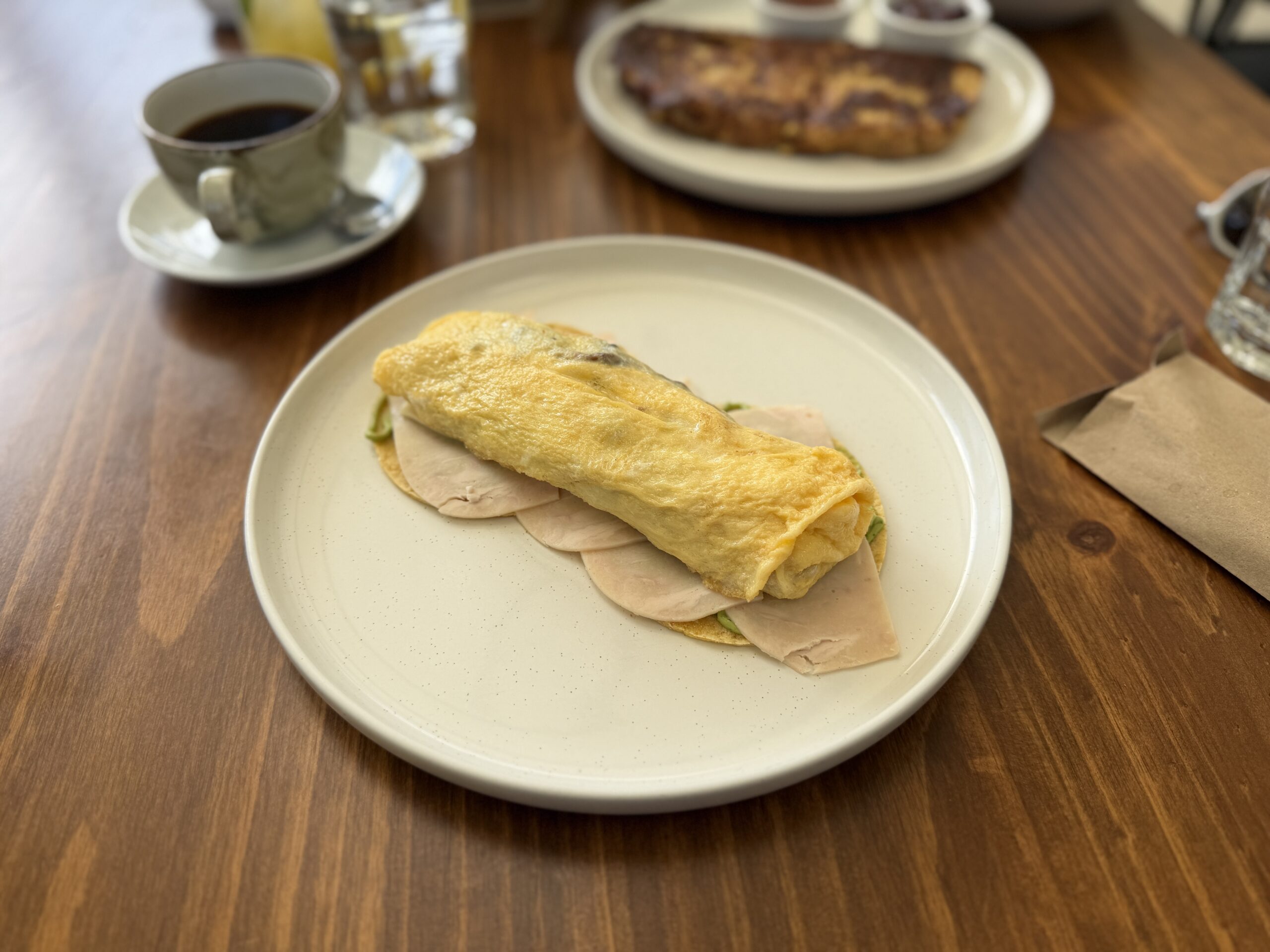 Tostada especial: Esta es la versión sin gluten sustituida por tortilla. Un omelette con chile morrón, hongos, capa de aguacate y queso fresco.