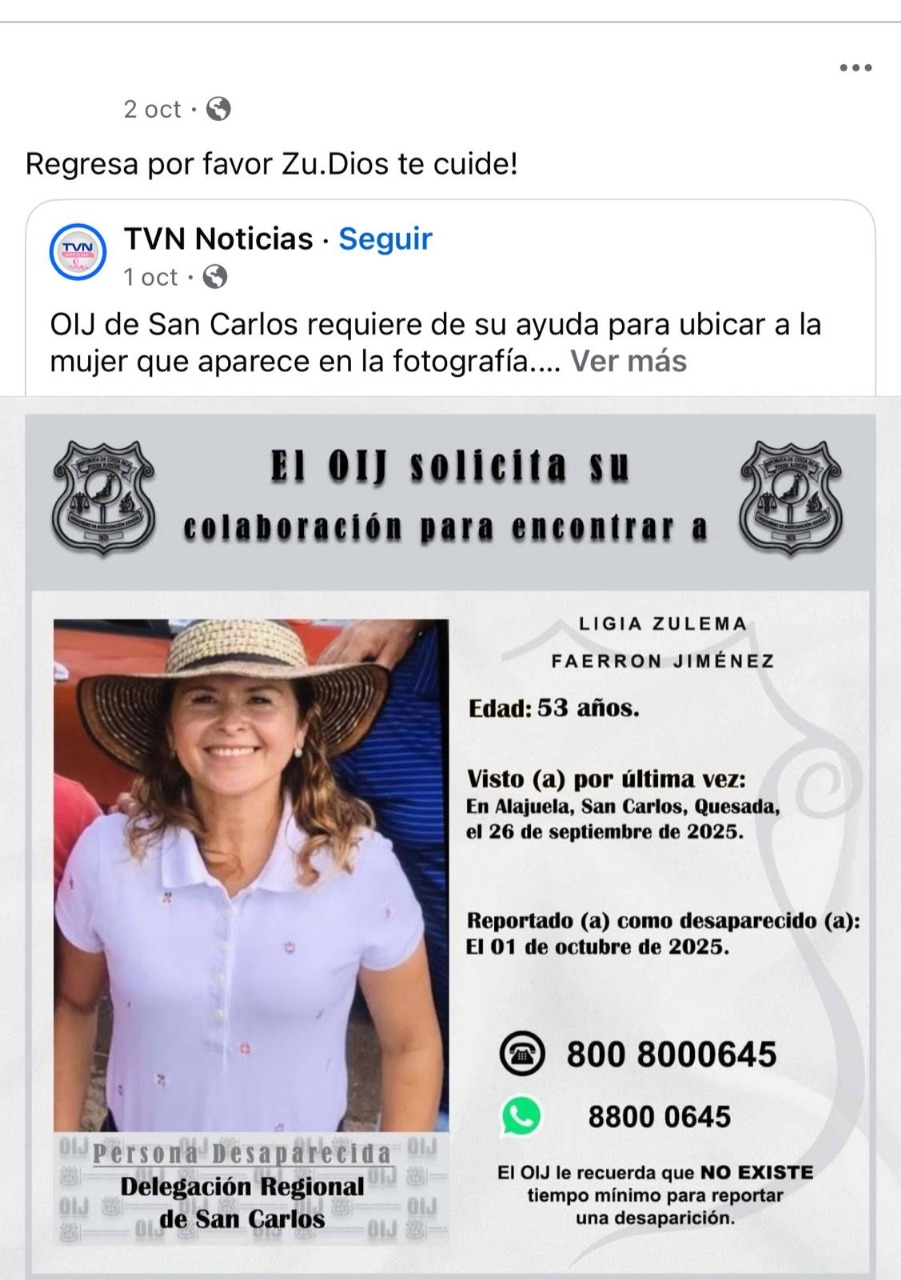 En medio de los operativos que realizan las autoridades judiciales en la Zona Norte, la familia de Ligia Zulema Faerron Jiménez —desaparecida desde el 26 de setiembre— pidió respeto y empatía.