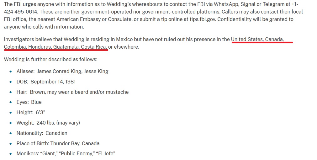 Además de Costa Rica, Wedding podría estar en Colombia, Honduras, Guatemala, EE. UU., Canadá o México. En este último país se cree que residió de manera permanente en meses recientes.