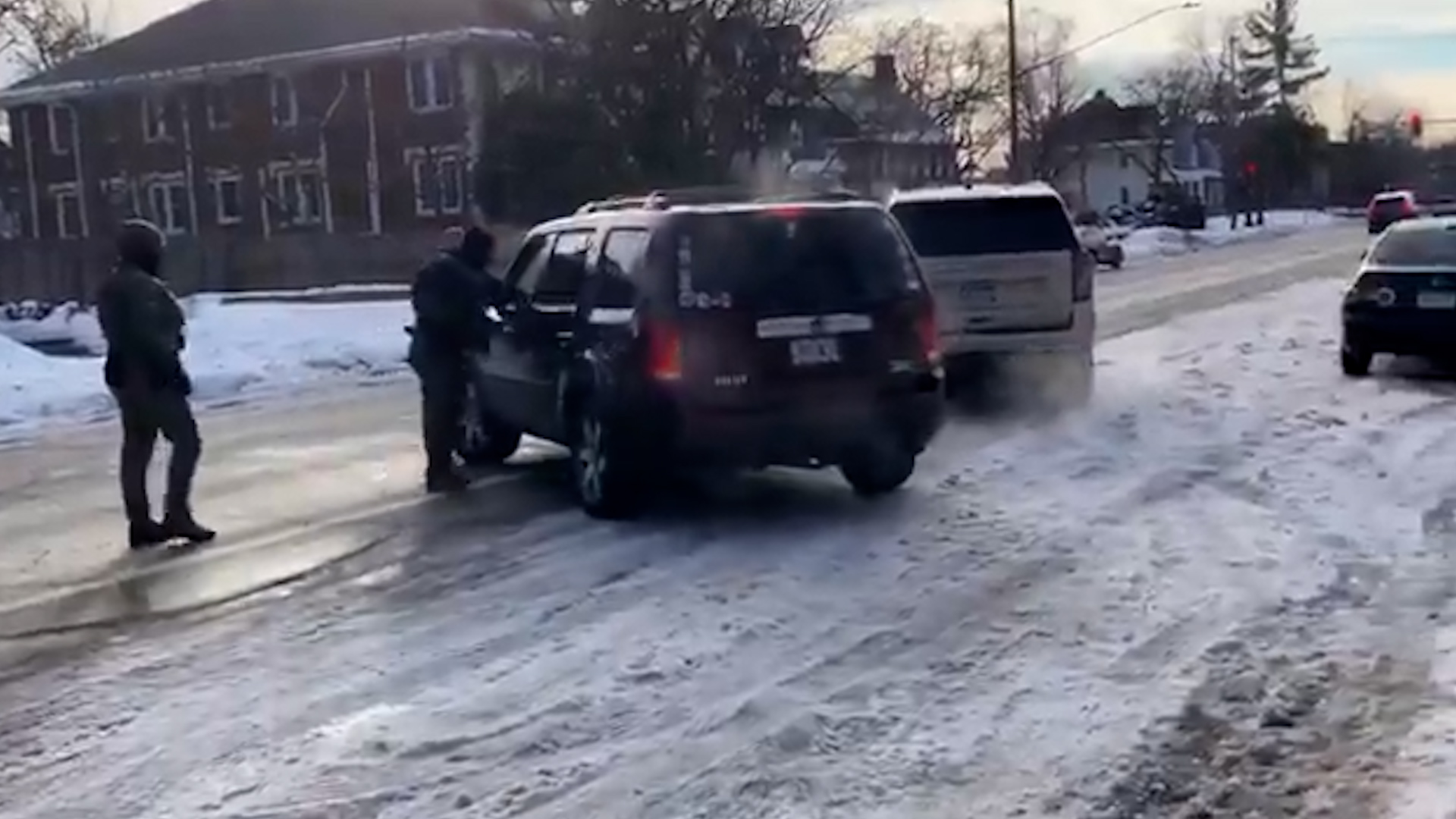 Un vídeo del incidente, que no ha sido verificado por la AFP, muestra un auto formato SUV maniobrando ante vehículos del ICE sin distintivos.