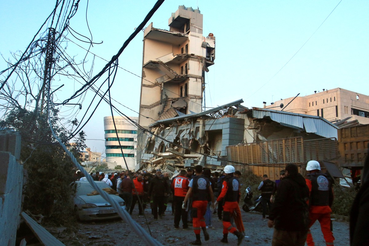 Rescatistas acuden al lugar de un ataque aéreo israelí contra las oficinas de Jamaa Islamiya en la ciudad costera de Sidón, al sur del Líbano, el 3 de marzo de 2026. AFP