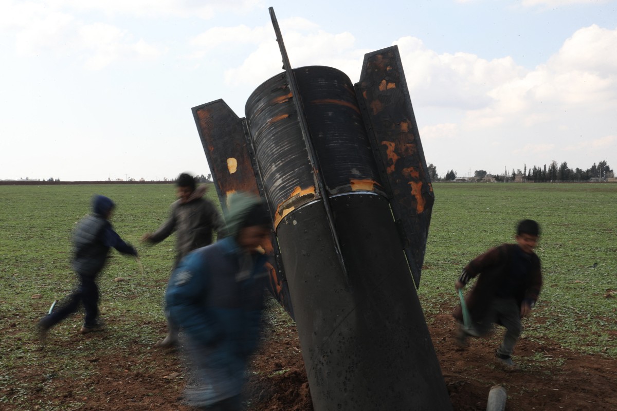 Niños juegan alrededor de un misil sin detonar que cayó en un campo abierto a las afueras de Qamishli, al este de Siria, el 5 de marzo de 2026. Los países del Golfo han sido blanco de repetidas oleadas de ataques con drones y misiles iraníes en represalia a la masiva campaña aérea estadounidense-israelí. (Foto de Delil SOULEIMAN / AFP)