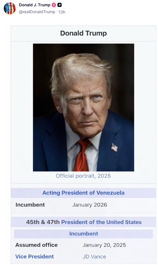 El presidente de Estados Unidos, Donald Trump, publicó en su red social Truth Social una imagen manipulada al estilo de Wikipedia en la que aparece referido como "Acting President of Venezuela" (Presidente interino de Venezuela) desde enero de 2026.