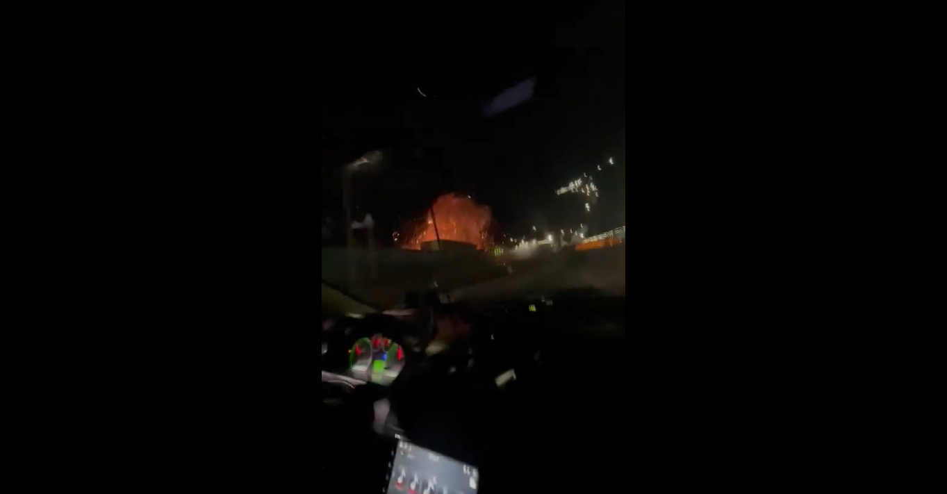 En las imágenes se aprecia cómo dos personas viajan a bordo de un vehículo, justo cuando aparecen gigantescas bolas de fuego como parte del bombardeo.