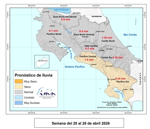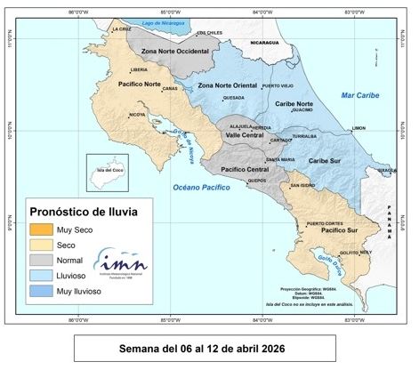 Tal como se puede observar en las imágenes compartidas por el IMN, para la primera semana completa de abril, del lunes 6 al domingo 12 se espera que en el Caribe Norte, Caribe Sur y la parte Oriental de la Zona Norte puedan darse algunas lluvias, mientras que el Pacífico Central y el Pacífico Sur estarán más secos de lo normal.