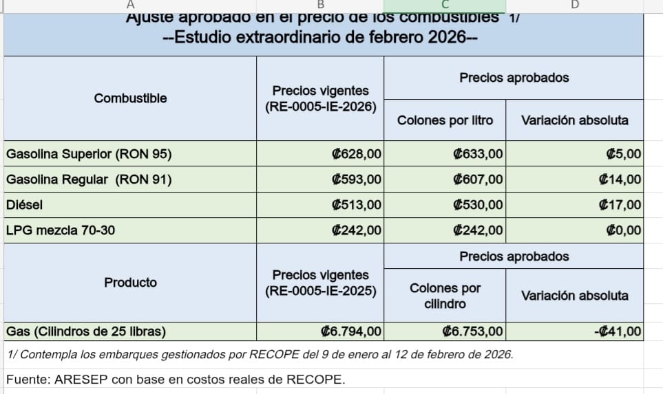 La Autoridad Reguladora de Servicios Públicos (Aresep) informó de un nuevo aumento en el precio de los combustibles como parte de un ajuste extraordinario correspondiente a febrero.