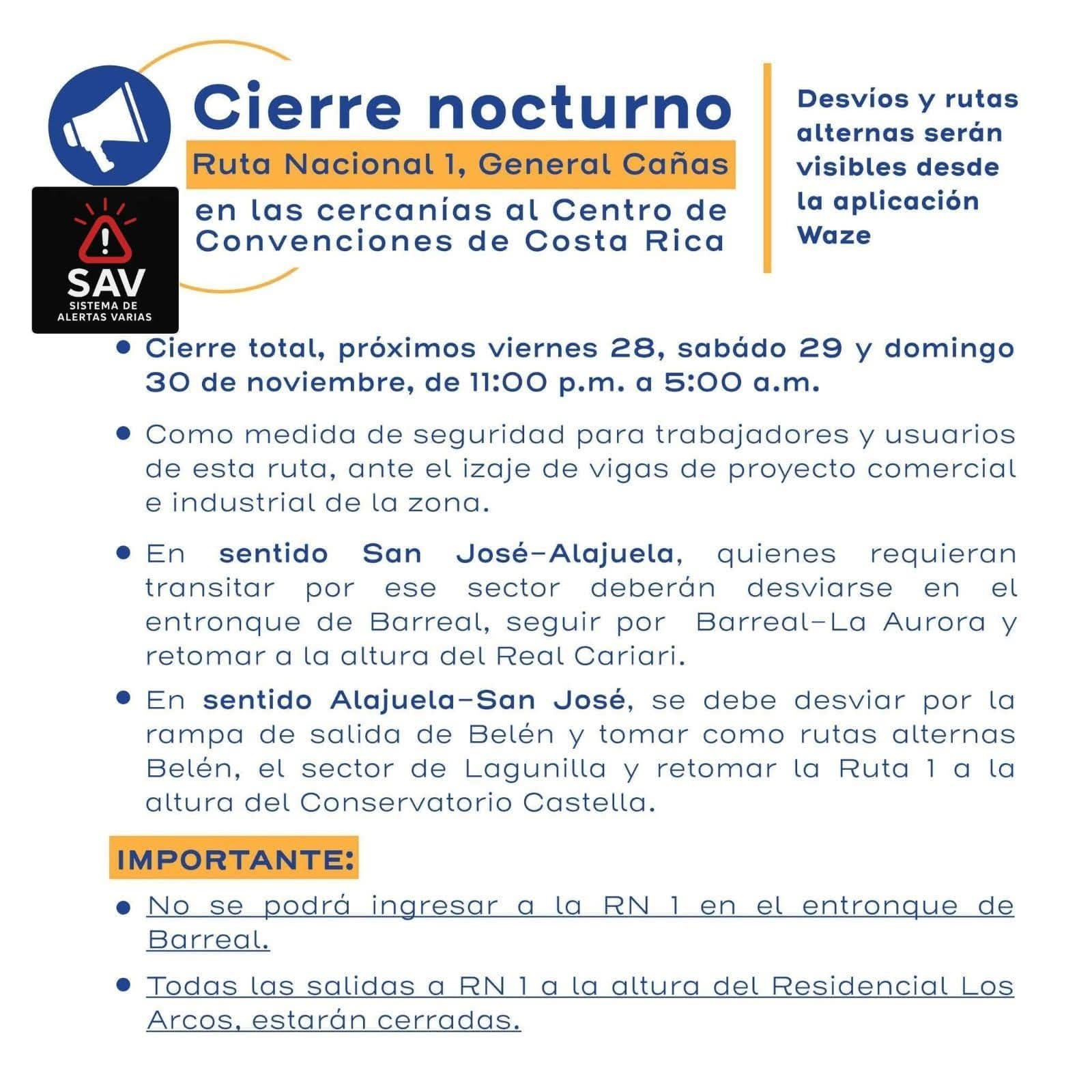 Si es de las personas que circula por las noches sobre la autopista General Cañas (ruta 1), le informamos que a partir del próximo viernes 28 de noviembre se implementarán varios cierres debido a la construcción de un paso a desnivel.