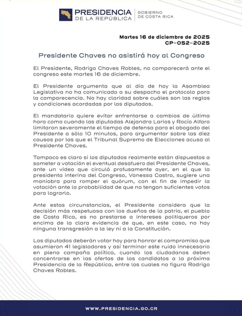 El presidente Rodrigo Chaves no asistirá al Plenario este martes a defender su fuero o inmunidad frente a los diputados que votarán si levantan o no esa protección para que el Tribunal Supremo de Elecciones (TSE) lo investigue por beligerancia política.