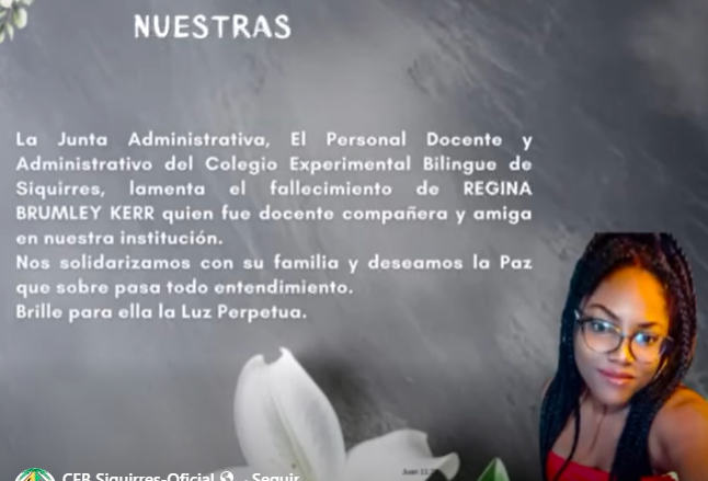 Funcionarios del Colegio Experimental Bilingüe de Siquirres lamentaron el fallecimiento de Regina Brumley Kerr, quien murió el pasado viernes 23 de enero tras someterse a una cirugía estética en una clínica privada.