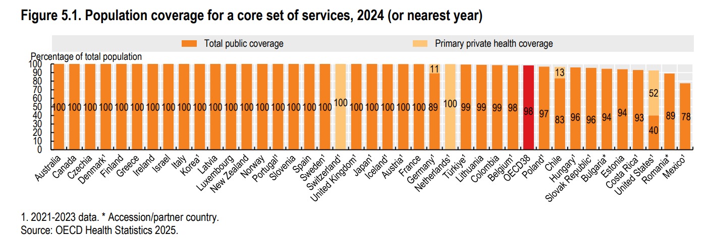 En Costa Rica, el 93% de la población está cubierta por servicios básicos de salud, es decir, consultas con doctores, exámenes, diagnósticos y atención hospitalaria. Durante 2024, solamente cuatro países de la OCDE registraron coberturas como la de Costa Rica, es decir, menores al 95%.