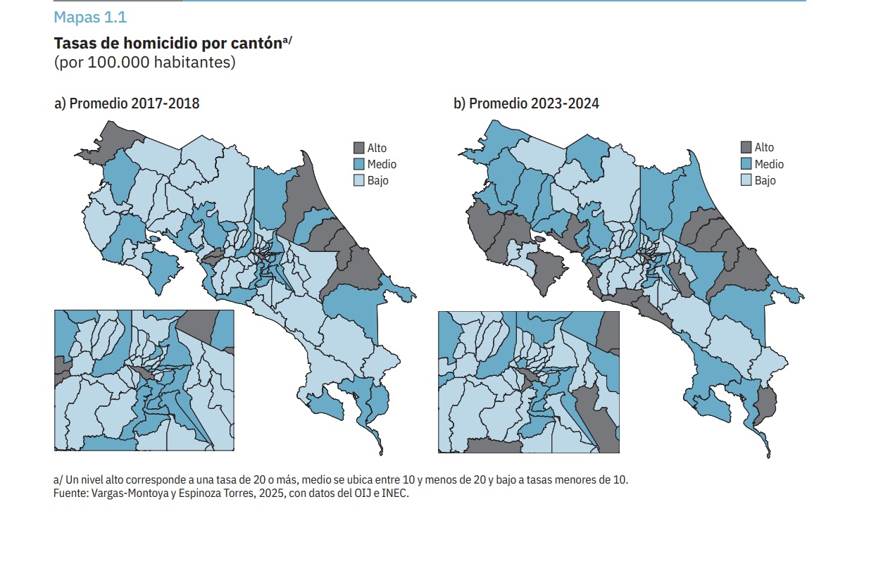 El informe del Estado de la Nación (PEN) fue enfático al analizar esta crisis que Fernández intentó desmentir. El documento afirma que Alajuelita, Guácimo, Nicoya, Puntarenas, Parrita, Corredores y Garabito pasaron de tasas medias de homicidios (10 a 20 por cada 100.000 habitantes) a tasas altas (superiores a 20). En Parrita el incremento llegó al 480%, alcanzando una tasa promedio de 90 en el bienio 2023-2024.