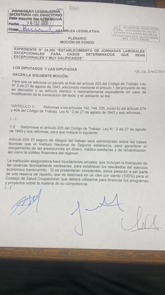 En una sesión que solo duró 40 minutos, el Plenario Legislativo aprobó una moción de fondo (880 de 2.654), con 31 votos a favor y 16 en contra, al expediente 24290 que busca establecer las jornadas laborales de 12 horas o jornadas 4×3, suspendiendo hasta nuevo aviso el trámite de vía rápida del texto hasta que se realicen las consultas obligatorias correspondientes.