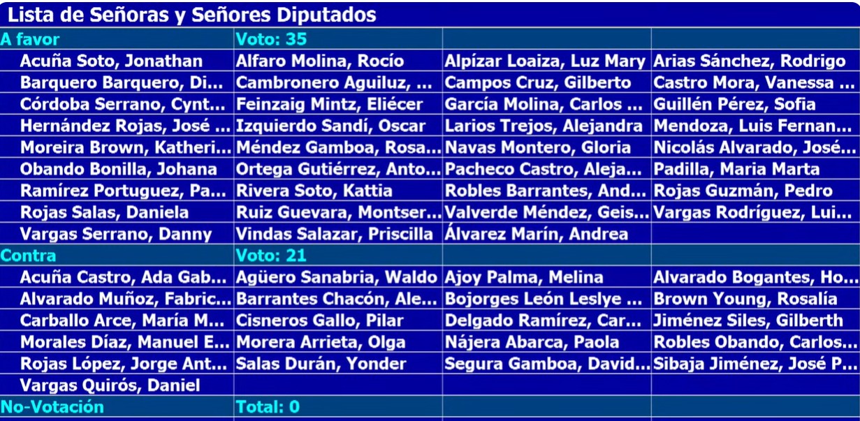 Se requerían 38 votos para levantar la inmunidad: pero solo se obtuvieron 35; 16 del PLN, 4 del PUSC, el Frente Amplio en pleno (6 votos), 2 congresistas del Liberal Progresista (PLP) y 6 diputaciones independientes.