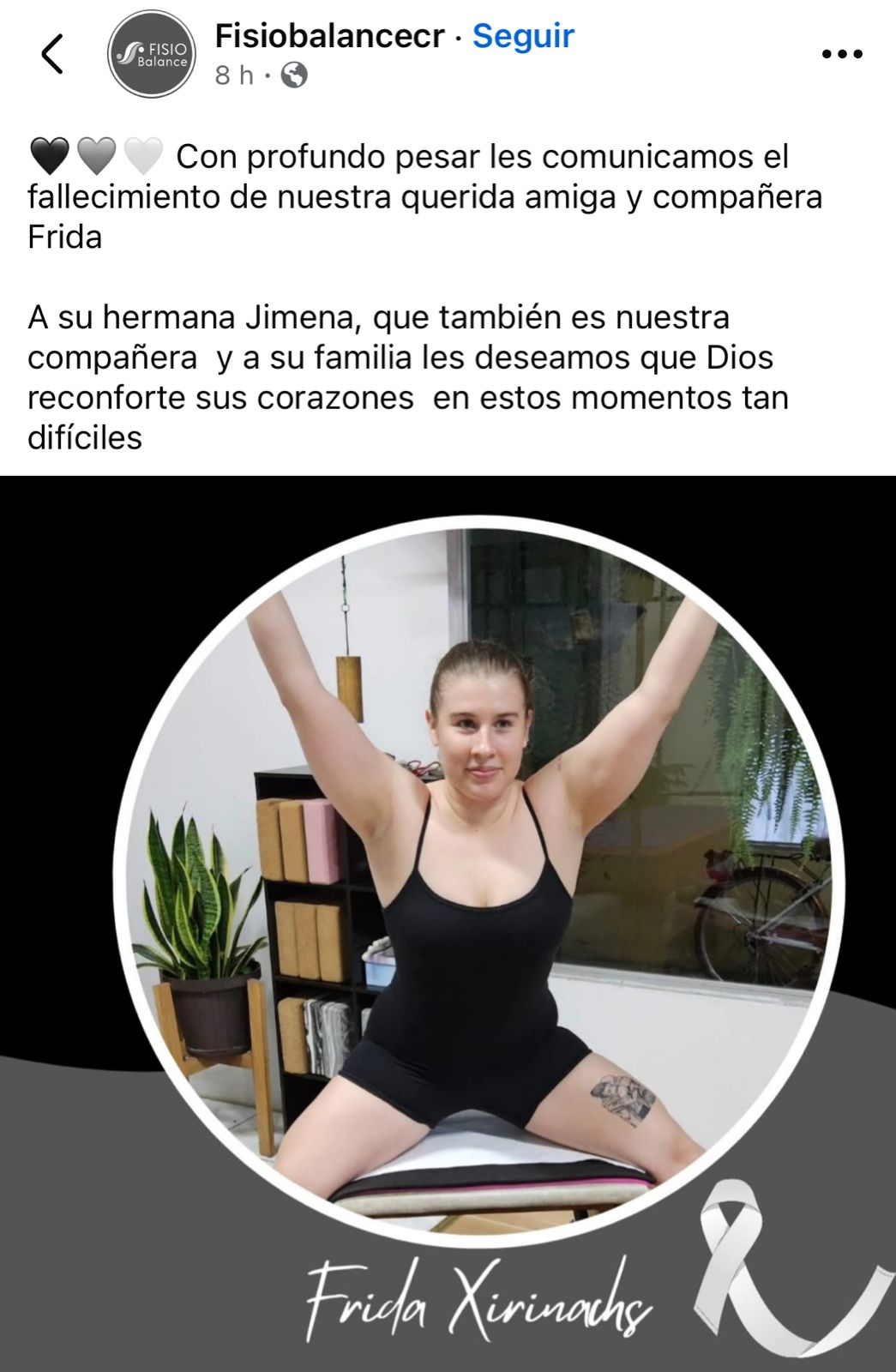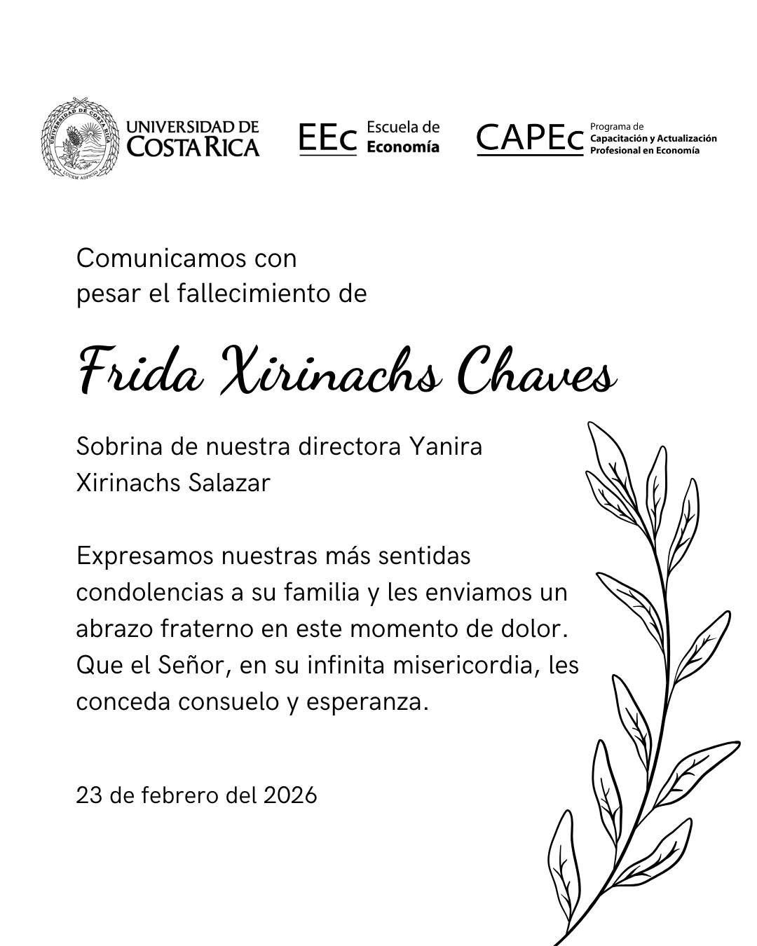 "Comunicamos con pesar el fallecimiento de Frida Xirinachs Chaves, sobrina de nuestra directora Yanira Xirinachs Salazar. Expresamos nuestras más sentidas condolencias a su familia y les enviamos un abrazo fraterno en este momento de dolor. Que el Señor, en su infinita misericordia, les conceda consuelo y esperanza".