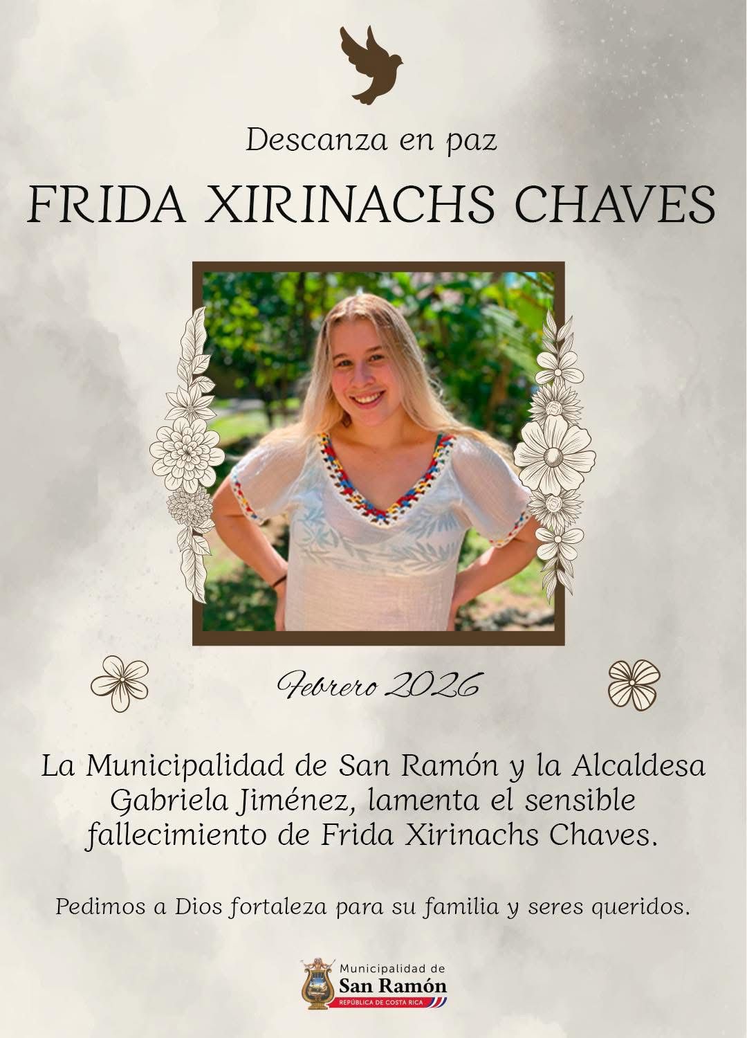 "La Municipalidad de San Ramón y la alcaldesa Gabriela Jiménez, lamenta el sensible fallecimiento de Frida Xirinachs Chaves. Pedimos a Dios fortaleza para su familia y seres queridos"