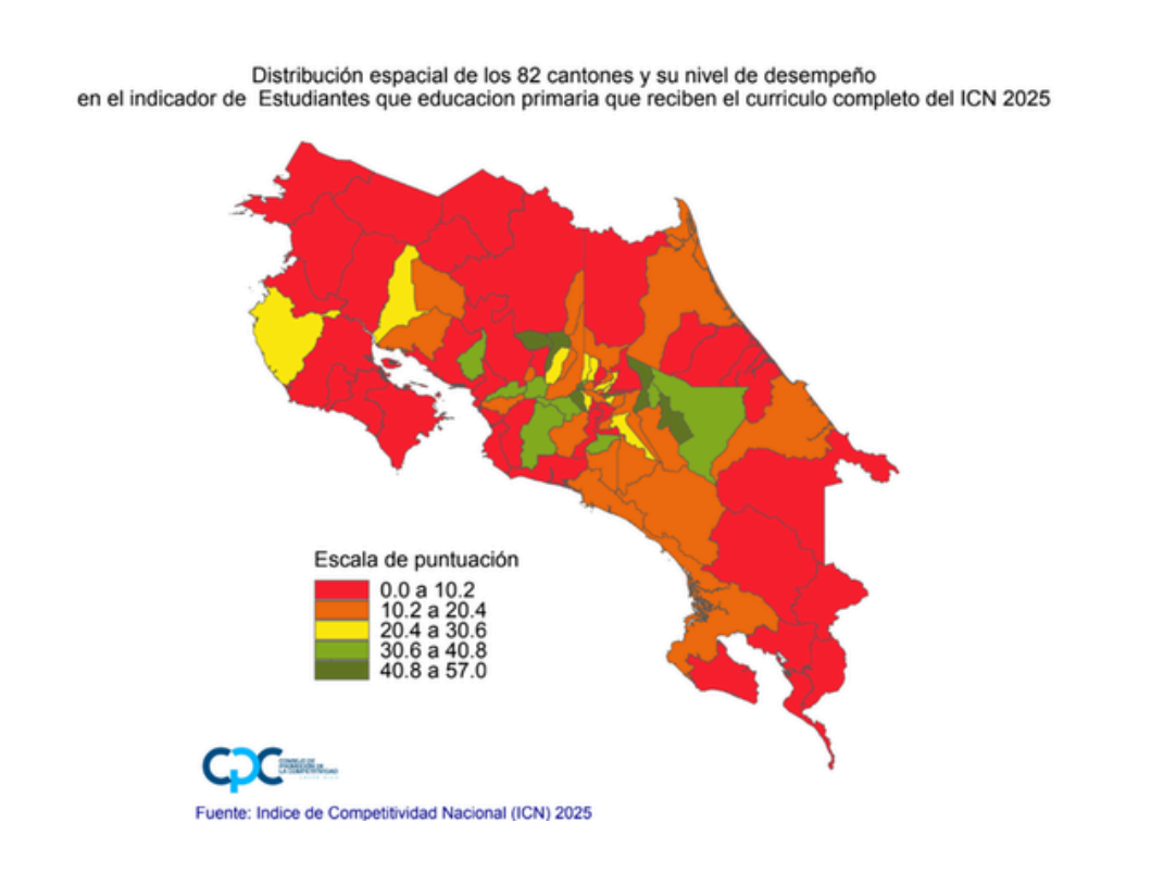 Así lo reveló el Índice de Competitividad Nacional (ICN) 2025 del Consejo de Promoción de la Competitividad (CPC), el cual detalla que en los cantones de Aserrí, Turrubares, Upala, Los Chiles, Guatuso, Carrillo, Nandayure, La Cruz, Hojancha, Esparza, Parrita, Garabito, Talamanca y Matina no hay un solo estudiante que reciba todas las materias completas del Ministerio de Educación Pública (MEP).