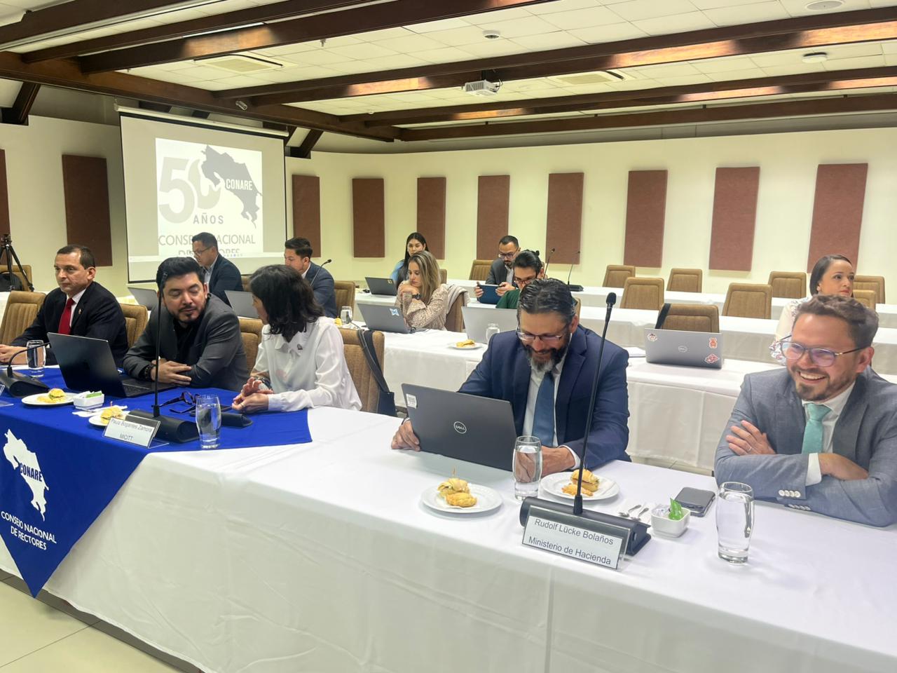 Por parte de las universidades públicas estan presentes los rectores Jorge Herrera Murillo, de la Universidad Nacional (UNA) —presidente del Conare—; Carlos Araya Leandro, de la UCR; María Estrada Sánchez, del Instituto Tecnológico de Costa Rica (TEC); Rodrigo Arias Camacho, de la Universidad Estatal a Distancia (UNED); y William Rojas Meléndez, de la Universidad Técnica Nacional (UTN).