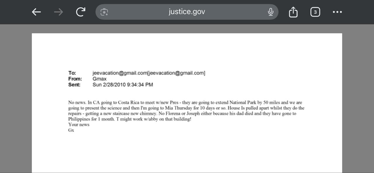 Costa Rica aparece 324 veces mencionada en correos electrónicos, llamadas y mensajes de los archivos de Jeffrey Epstein, revelados por el Departamento de Justicia de los Estados Unidos. Entre ellos, existe un e-mail de Ghislaine Maxwell a Epstein, en el que cita un viaje a Costa Rica.
