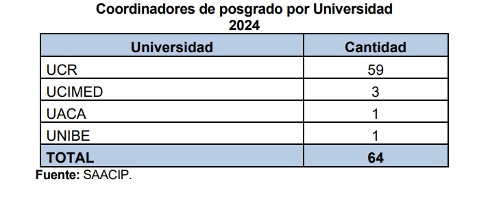 Esta tendencia se replica en el personal de gestión del posgrado. La UCR concentra una vasta mayoría de los coordinadores, representando el 92.2% del total de coordinadores de posgrado.