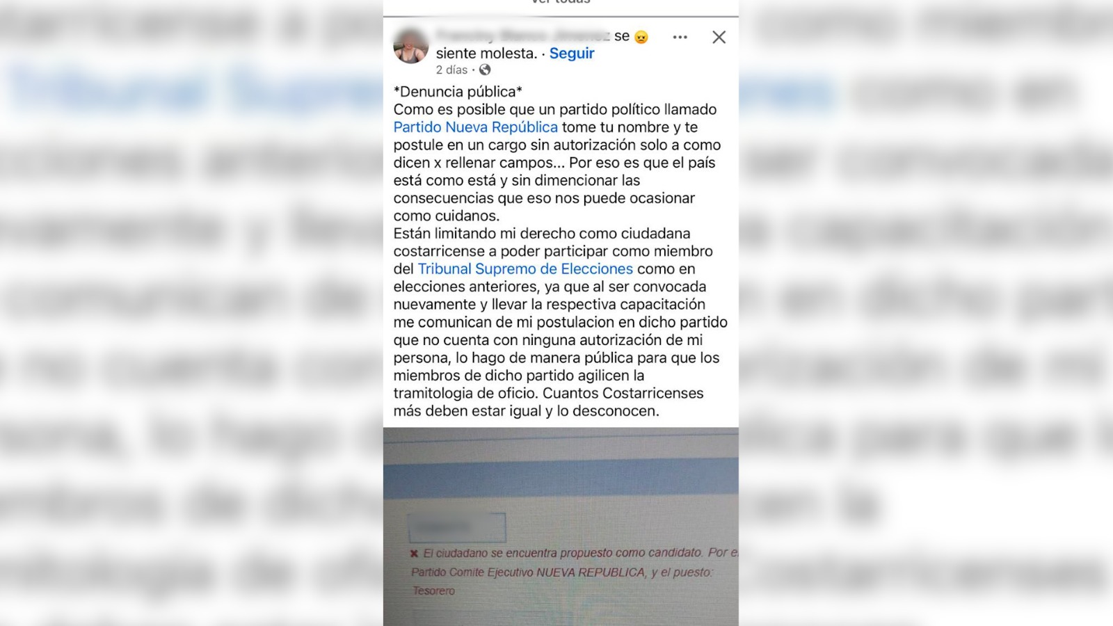 Una ciudadana de apellido Blanco Jiménez denunció que el Partido Nueva República(R) la inscribió recientemente como tesorera de la agrupación sin su consentimiento, situación que le impide postularse como auxiliar electoral del Tribunal Supremo de Elecciones (TSE), cargo por el cual percibiría una retribución económica, durante la actual campaña electoral.