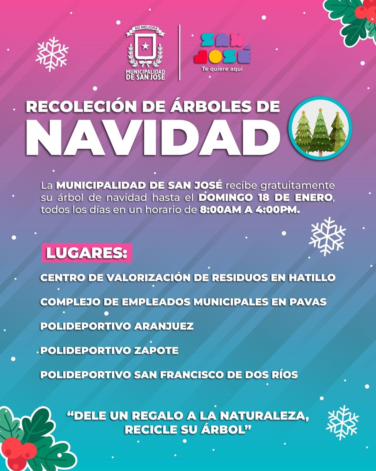 Si para esta Navidad usted adquirió un árbol natural y aún no sabe qué hacer con él, no lo deseche. Puede contribuir al cuidado del medio ambiente donándolo mediante la campaña de recolección de árboles de Navidad, bajo el lema "Dele un regalo a la naturaleza, recicle su árbol", organizada por la Municipalidad de San José.