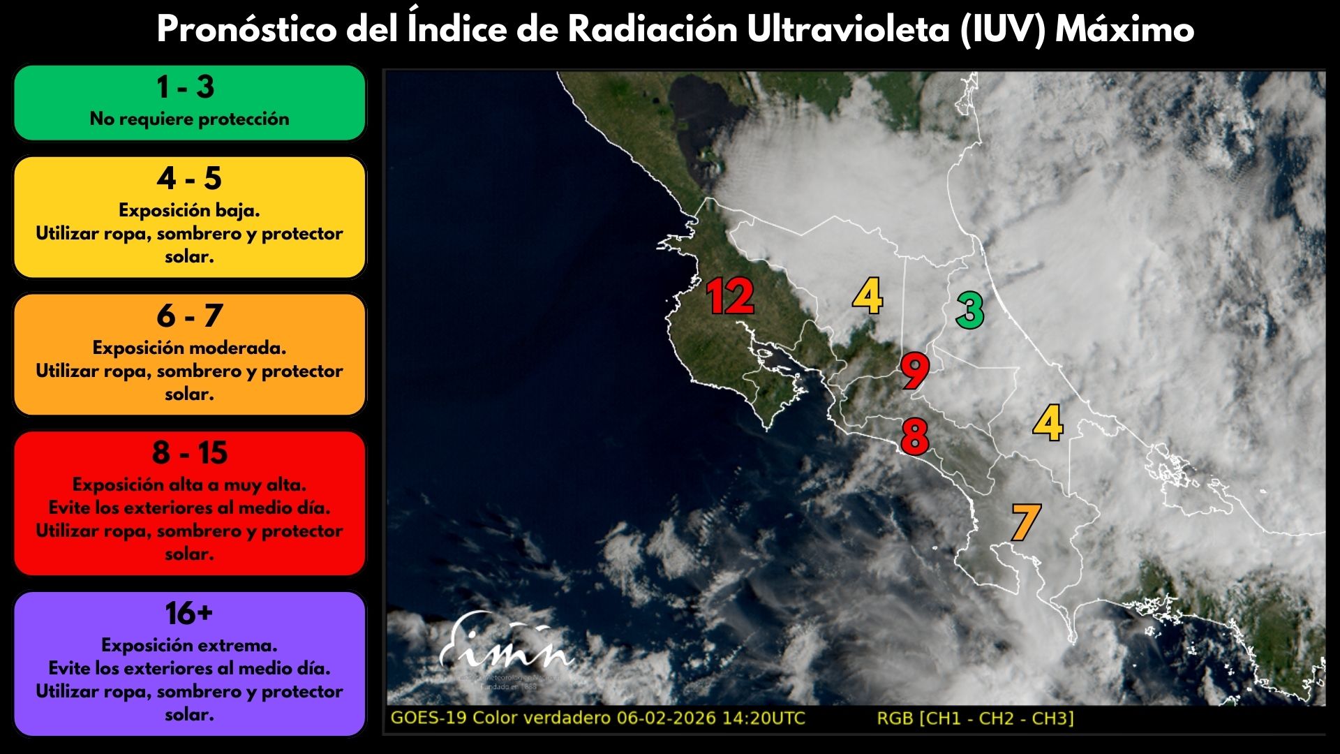 Tal como se puede observar en una imagen compartida por el Instituto Meteorológico Nacional (IMN), la mayoría de la Gran Área Metropolitana (GAM) se encuentra entre nivel 9 y 8 que se considera muy alto, por lo que se recomienda no estar en exteriores cerca del mediodía y cubrirse utilizando ropa y protector solar.