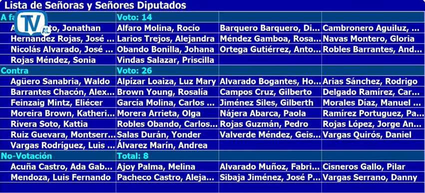 En contra votó el oficialismo; Rodrigo Arias, Carolina Delgado, Katherine Moreira, Paulina Ramírez, Pedro Rojas, Montserrat Ruiz, Geison Valverde y Andrea Álvarez, del PLN; la Unidad Social Cristiana (PUSC); Nueva República; el PLP; Luz Mary Alpízar del PPSD y los independientes Gilbert Jiménez y Luis Diego Vargas.