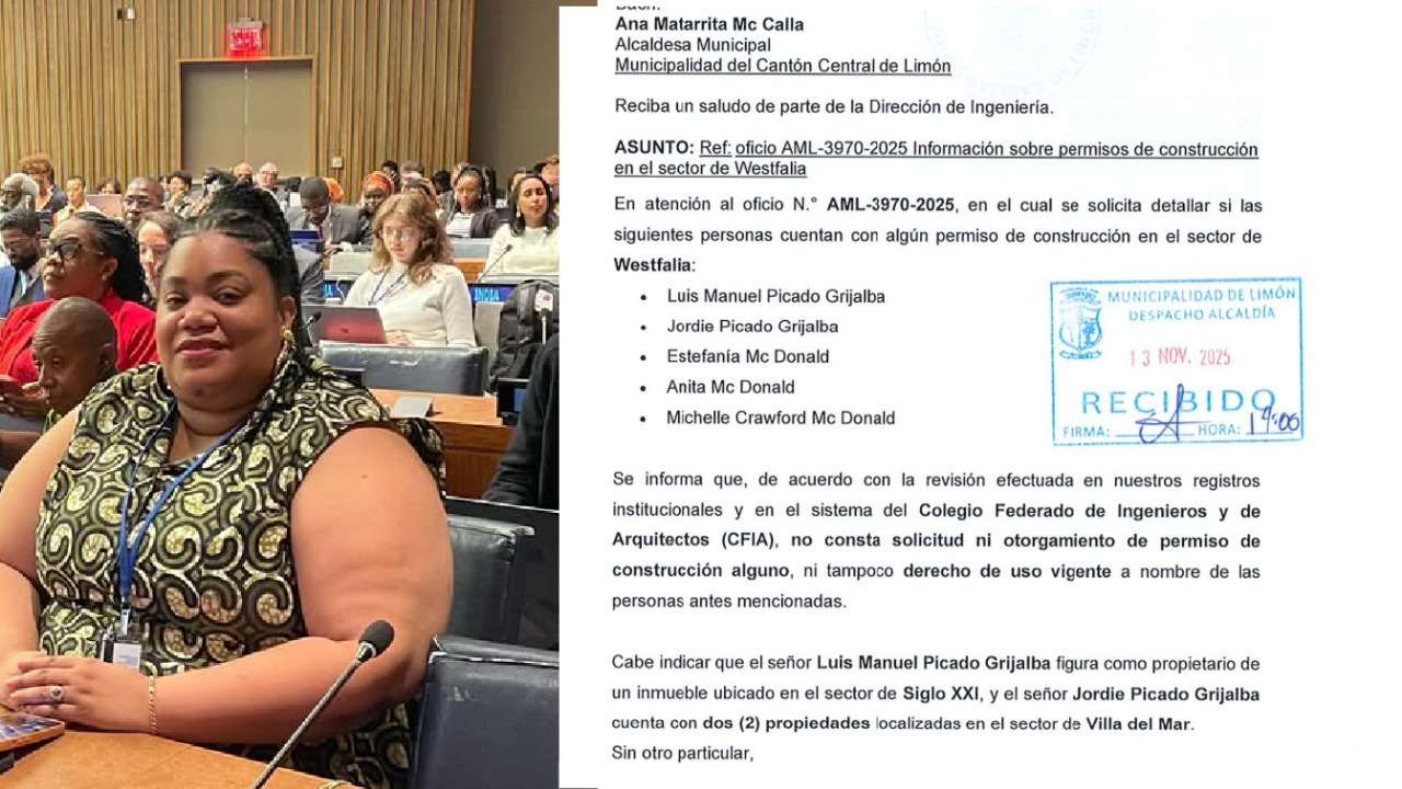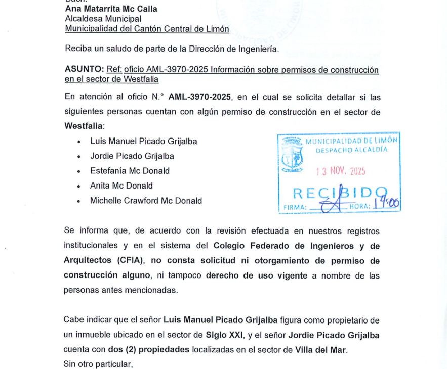 La alcaldesa de Limón, Ana Matarrita Mc Calla. confirmó por medio de un oficio que no hay permisos de construcción ni derechos para las construcciones en esa zona de Westfalia.