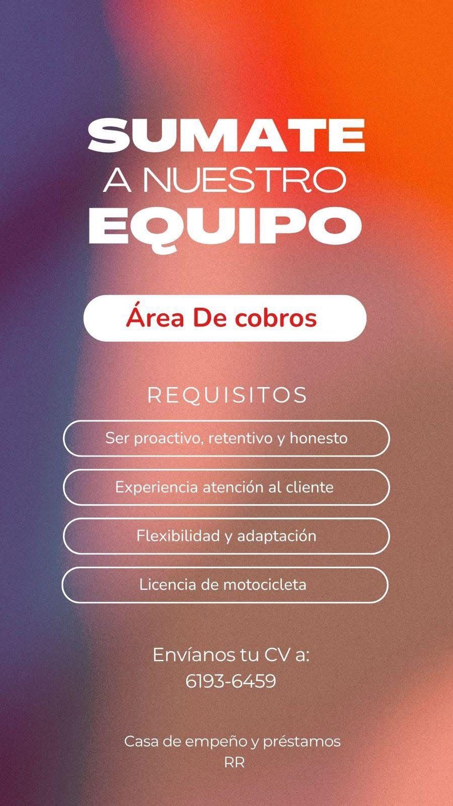 La imagen muestra un anuncio en el que se invitaba a "sumarse al equipo" específicamente en el área de cobros. El aviso solicitaba personas con licencia de motocicleta.