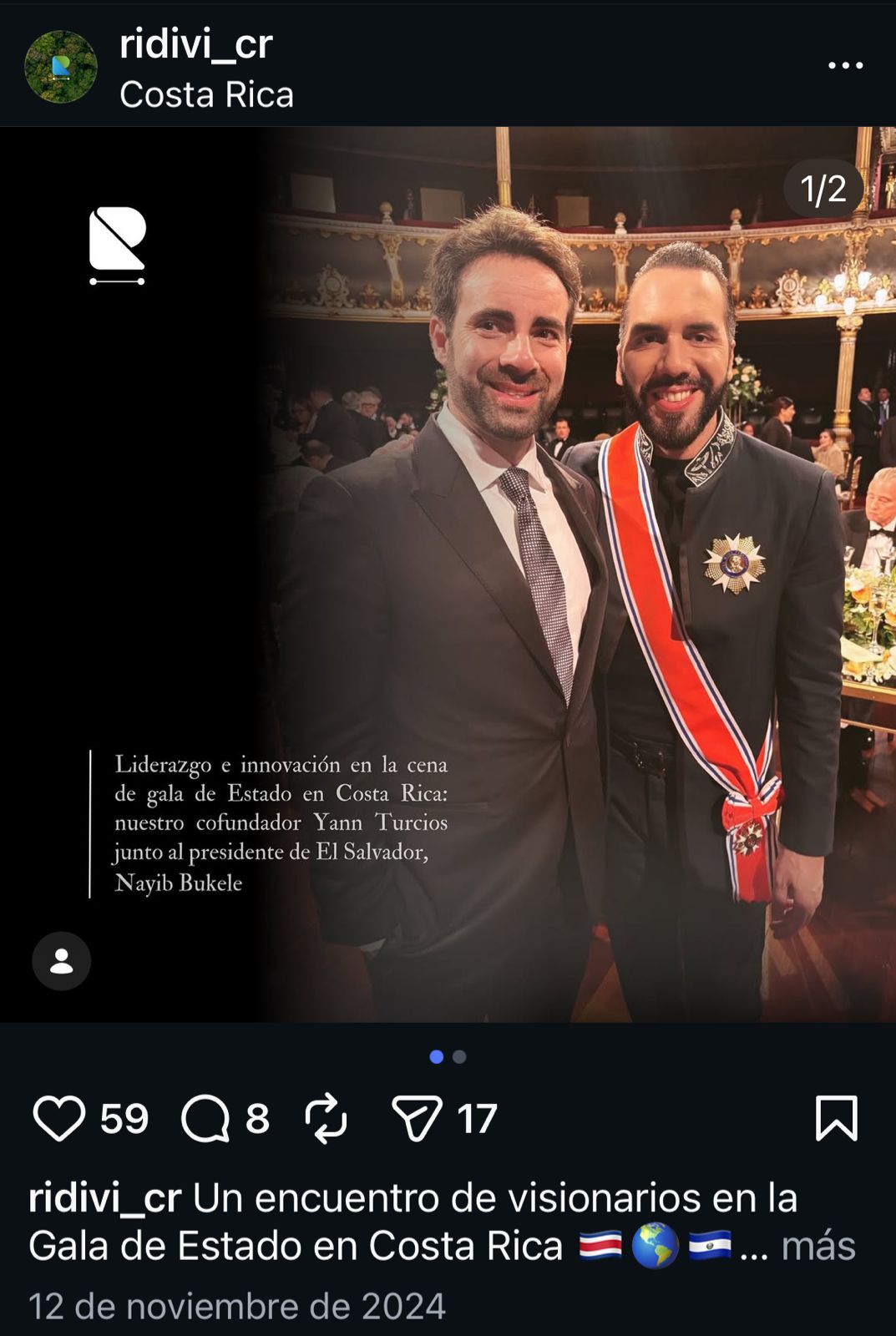 Además, añadió la leyenda: "Liderazgo e innovación en la cena de gala de Estado en Costa Rica: nuestro cofundador Yann Turcios, junto al presidente de El Salvador Nayib Bukele". En esta imagen aparece únicamente acompañado por el mandatario salvadoreño.