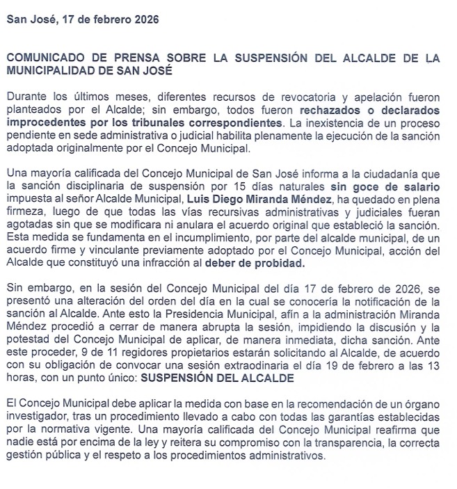 "La sesión del Concejo Municipal del día 17 de febrero de 2026, se presentó una alteración del orden del día en la cual se conocería la notificación de la sanción al Alcalde. Ante esto la Presidencia Municipal, afín a la administración Miranda Méndez procedió a cerrar de manera abrupta la sesión, impidiendo la discusión y la potestad del Concejo Municipal de aplicar, de manera inmediata, dicha sanción", detallan los regidores por medio de un pronunciamiento en conjunto.