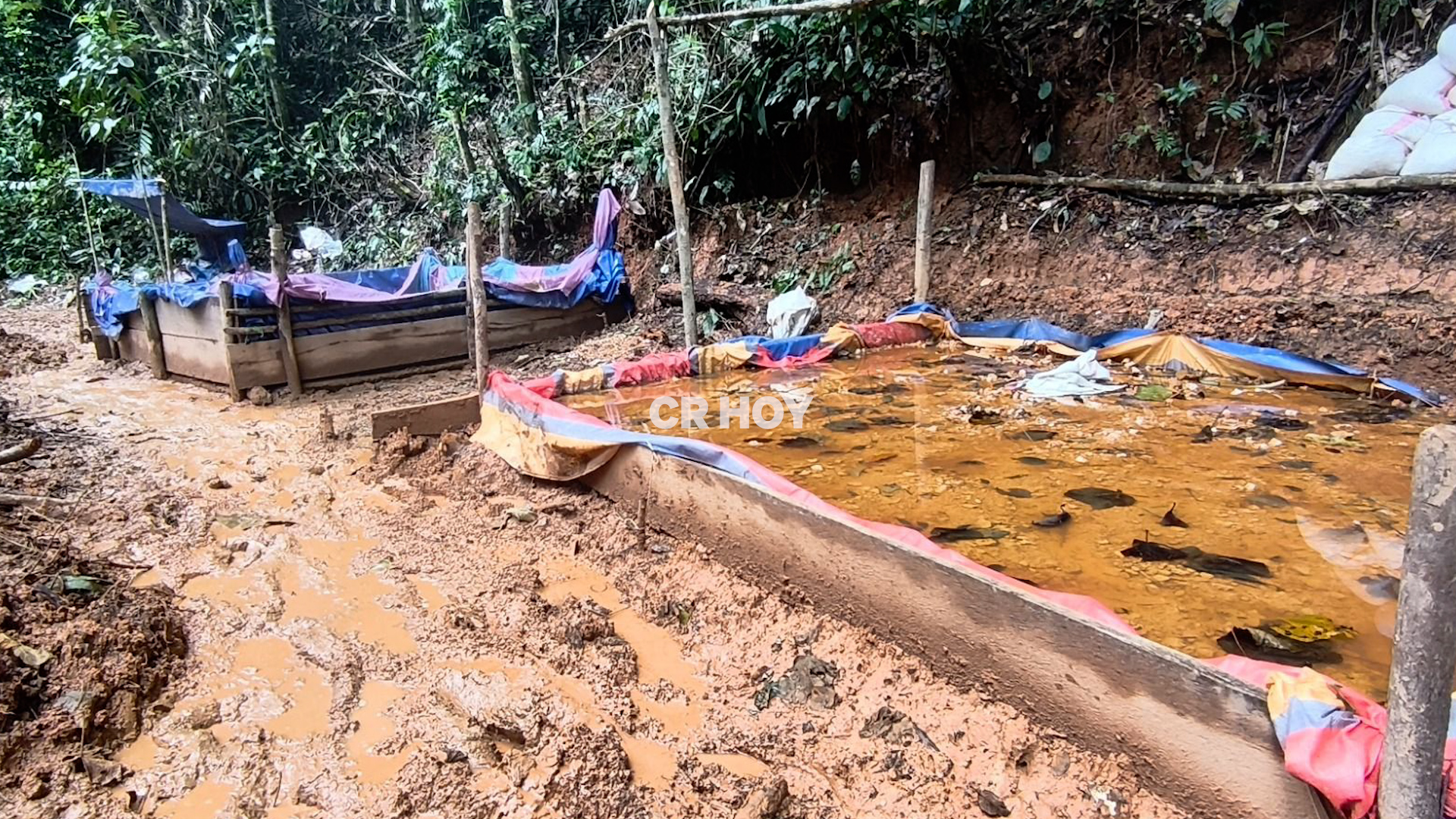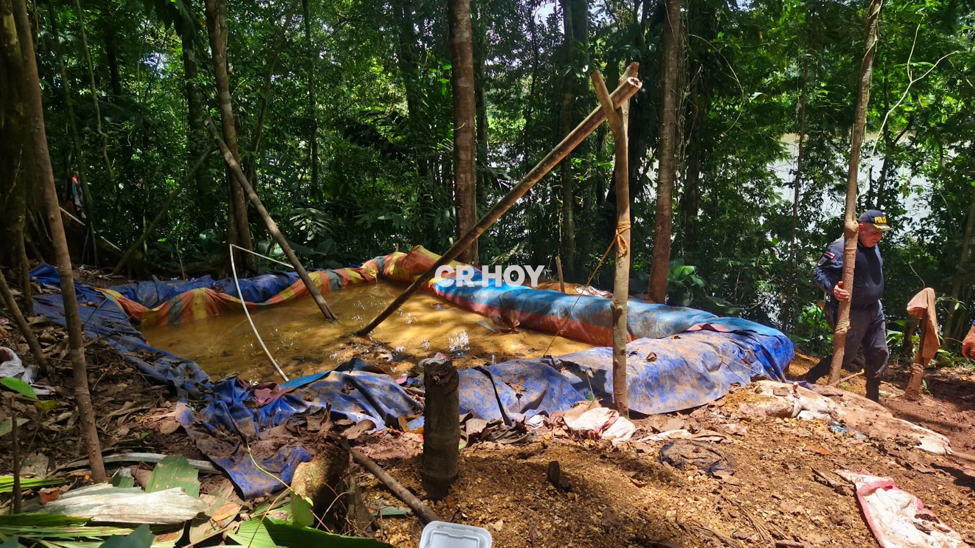 En las imágenes se observa una especie de piscina artesanal recubierta con plástico, que contiene una mezcla de agua turbia y sedimentos, presumiblemente utilizada en procesos de lixiviación para la extracción de oro. A su alrededor hay sacos, herramientas rudimentarias y toldos improvisados, lo que evidencia una operación activa y sin ningún tipo de control ambiental.