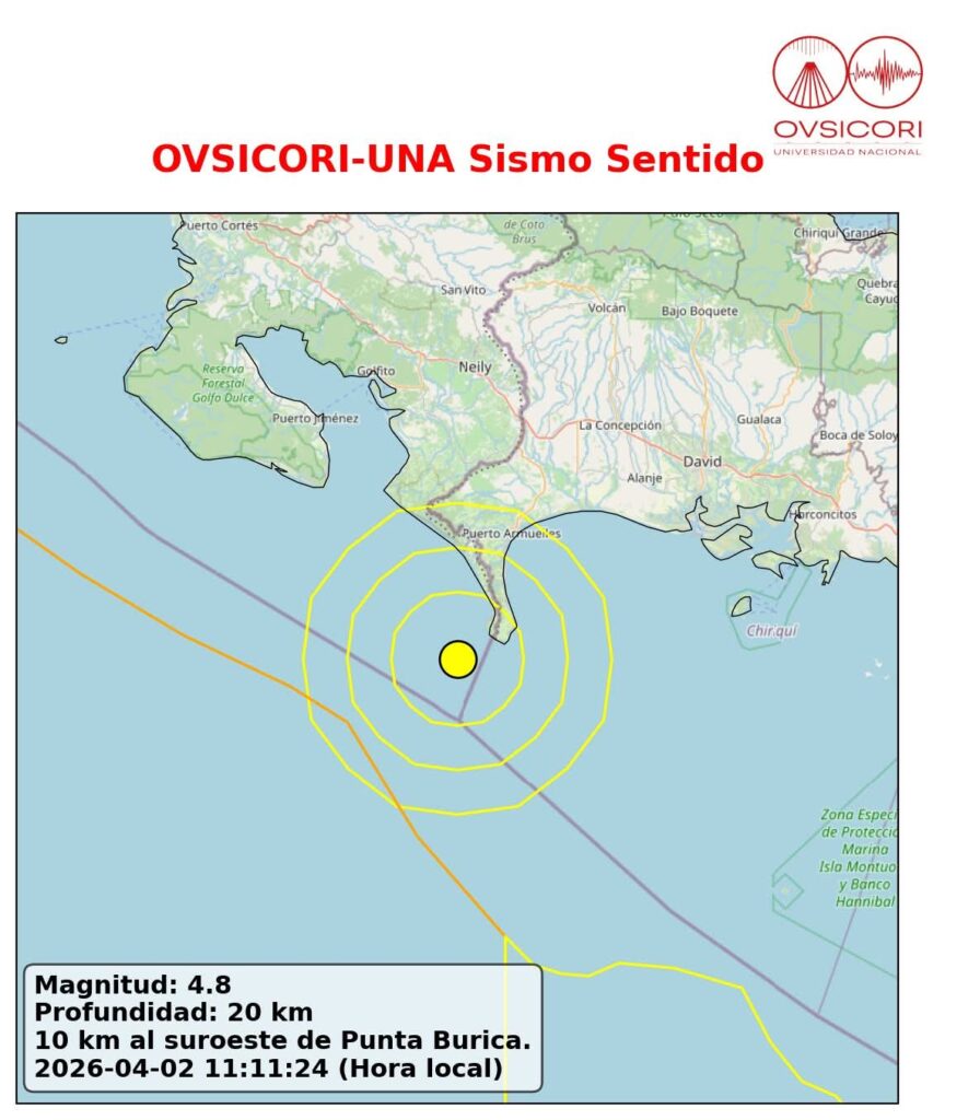 El hecho se presentó a las 11:11 a.m., aproximadamente a 20 kilómetros de Punta Burica, en la frontera sur del país.