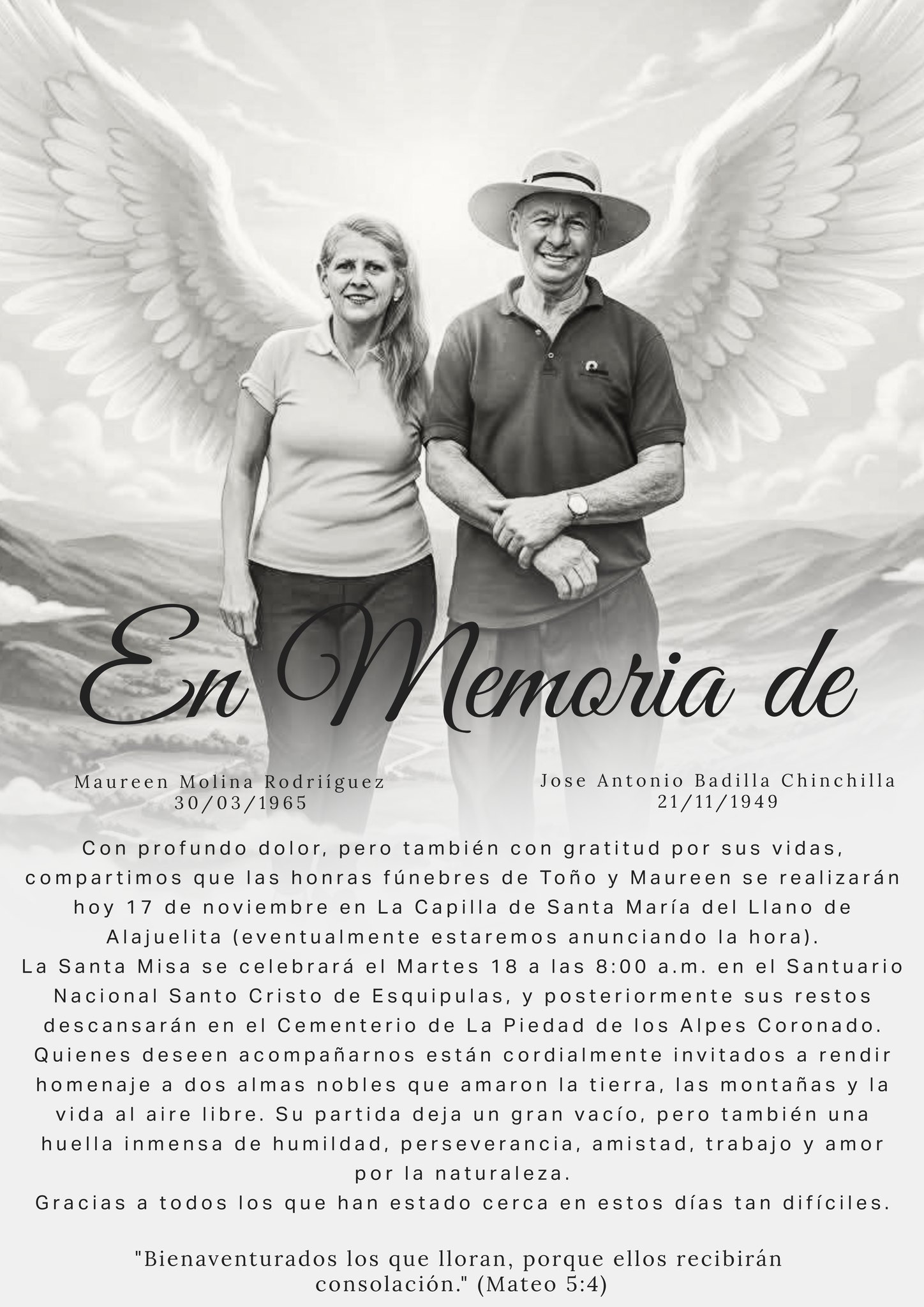 "Con profundo dolor, pero también con gratitud por sus vidas. Compartimos que las honras fúnebres de Toño y Maureen se realizarán hoy 17 de noviembre en La Capilla de Santa María del Llano de Alajuelita (eventualmente estaremos anunciando la hora). La Santa Misa se celebrará el martes 18 a las 8:00 a.m. en el Santuario Nacional Santo Cristo de Esquipulas, y posteriormente sus restos descansarán en el Cementerio de La Piedad de los Alpes Coronado.