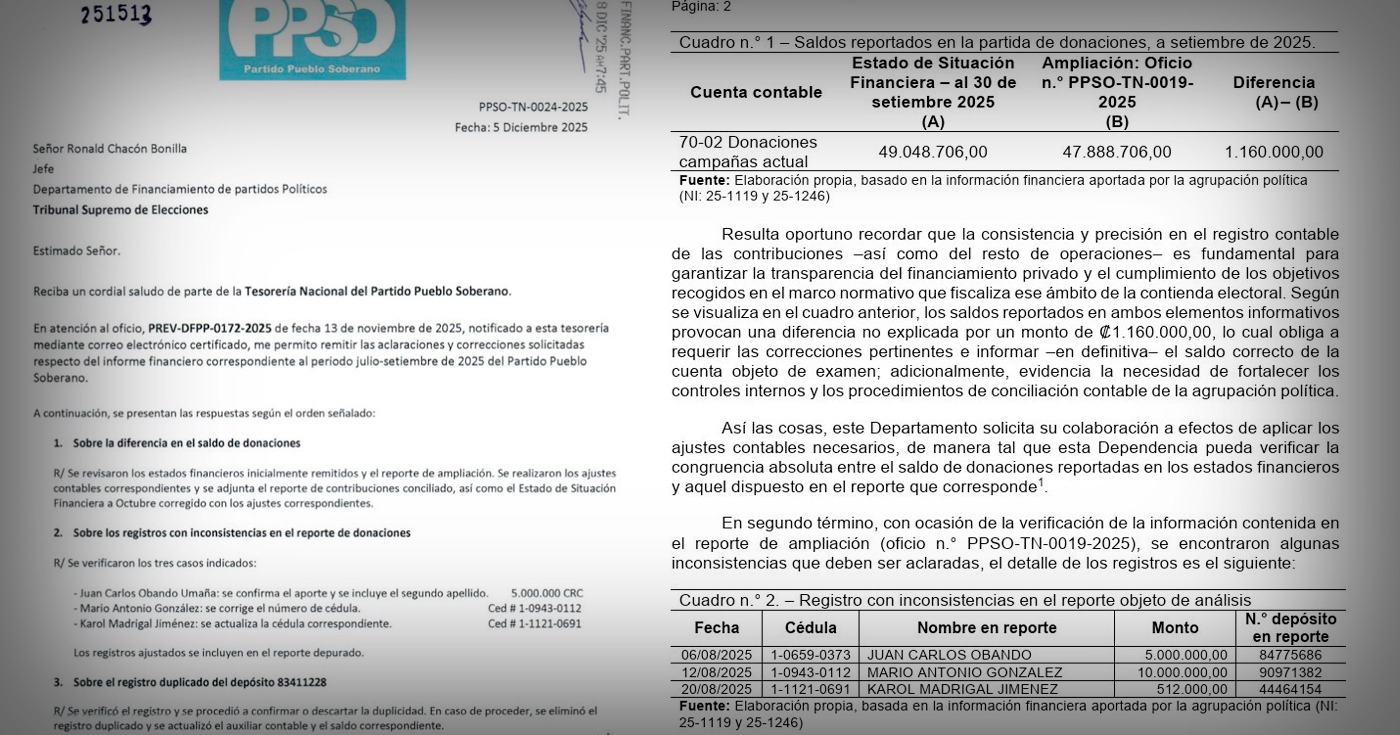En respuesta a una consulta de este medio, el TSE indicó que, conforme lo establece el Código Electoral (Ley n.° 8765), el 21 de octubre de 2025 el Partido Pueblo Soberano presentó su informe financiero del tercer trimestre del año ante el Departamento de Financiamiento de Partidos Políticos. Posteriormente, el 31 de octubre, la agrupación remitió información adicional.