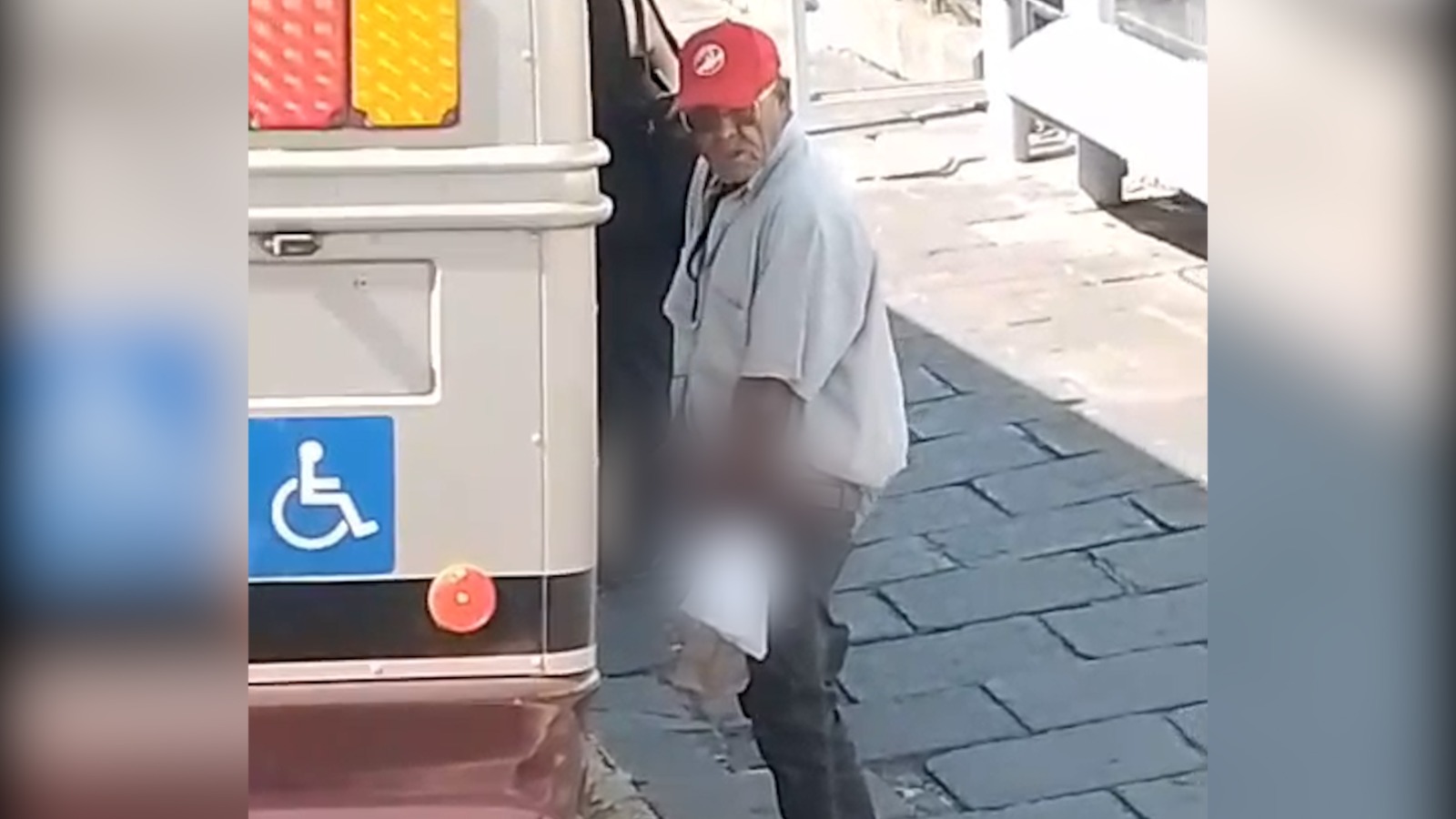 El sujeto aprovecha la cercanía de un bus para bajarse el zipper del pantalón y realizar los actos obscenos a vista y paciencia de todos.